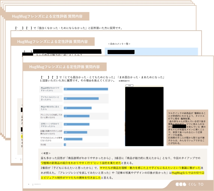 タイアップ広告を掲載後、HugMugフレンズのママたちに記事の感想をアンケート調査。PV数などの定量評価だけでは分からない、ターゲットに響いた訴求ポイントや、商品・サービスの強みを知ることができます。マーケティングや今後の広告・PR企画を考える際のヒントにもなります。