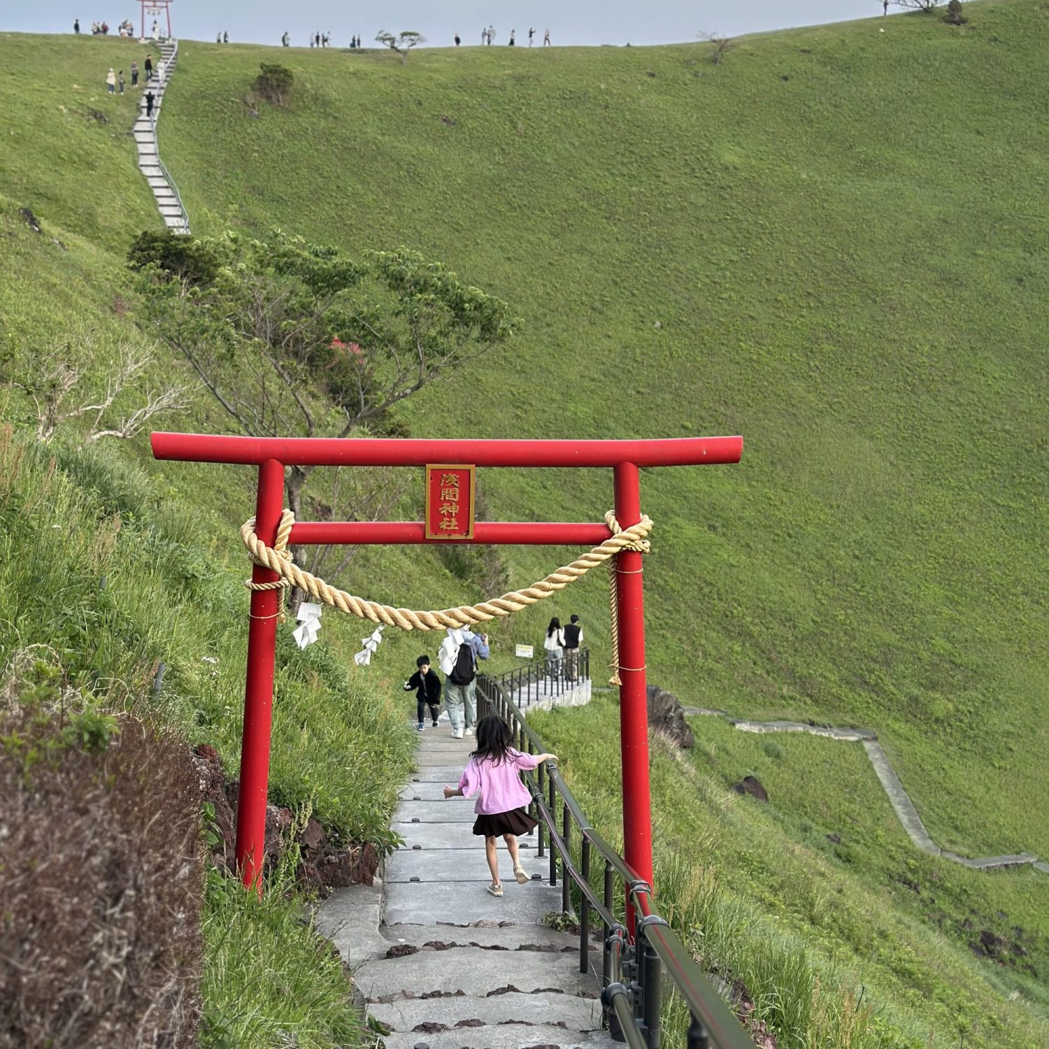 山の火口にある鳥居をくぐり、階段を降りたり登ったりした先に、安産と縁結びの神さまの浅間神社がありました。