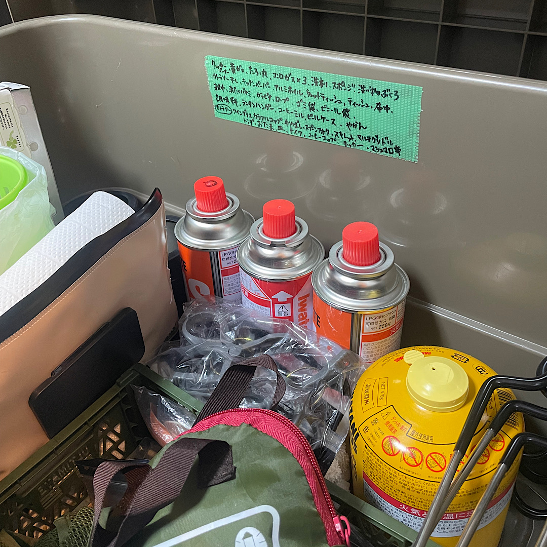 細々した荷物はコンテナに収納したままで、そのまま積荷をしているのですが、普段使いするものや、新たに足すもの、調味料や消耗品など意外と入れ忘れてしまうものもあったり。