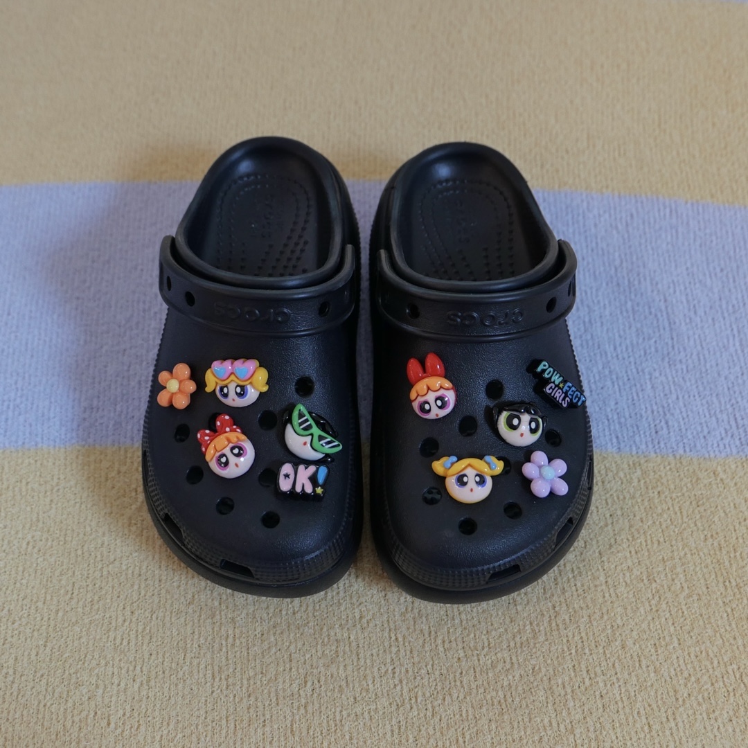 今回は韓国旅行で見つけた大好きパワーパフガールズのジビッツを付けるために、「これには黒が合いそう」とのことで黒の厚底タイプを選んでいました。