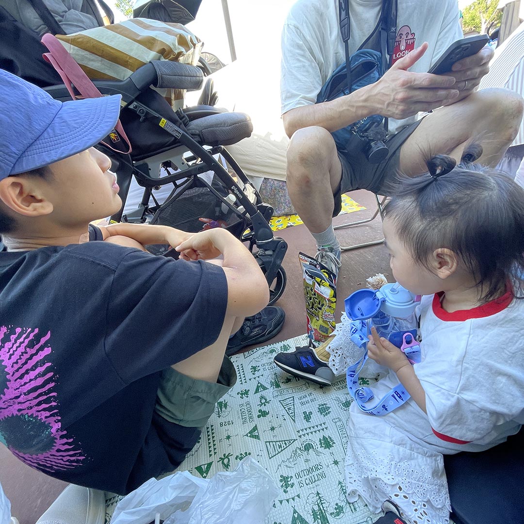 7時ちょっと過ぎに着くことができたので、植木横の日陰にシートを敷いてOPEN待ちをする事に。レジャーシートと、折り畳みミニイスがあると日陰だったので、風がふくと爽やかで朝ごはんに買ったおにぎりやパンなどを食べながら待っていたら、この日は8時45分にOPENするとアナウンスがあり、あっという間に荷物検査の時間に👀