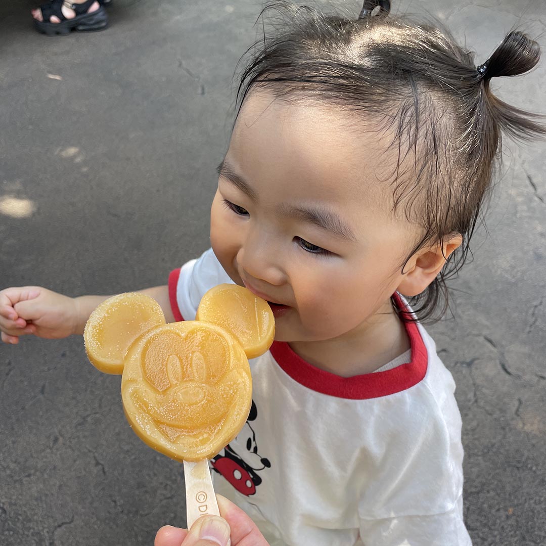 暑かったので、アイスを買って身体の中から冷やすことに。ミニーちゃんシェイプの可愛いアイスに娘もメロメロです🍦