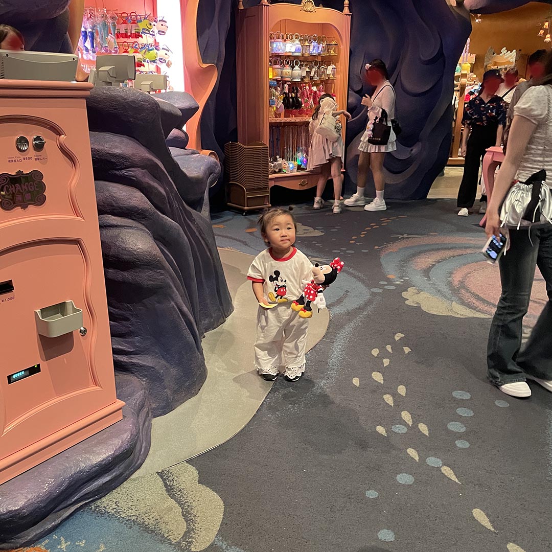 スリーピーホエールショップでそのままお土産が見れるのも👍ベイマックスのカプセルトイや、ミニーちゃんのぬいぐるみをばあばに買ってもらって大満足♪