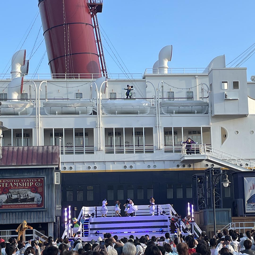 ショーがスタート‼️ミッキーが船の上から登場‼️非課金なので後方でしたが、ステージはよく見えました👀アップテンポの音楽と野外のロケーションがフェスのようで大盛り上がり〜🤩