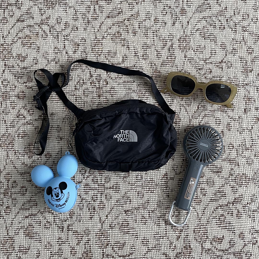 ⇧トップス・ボトムス:しまむら サングラス・バッグ:DAISO ミッキーフィギュア:ディズニーランド