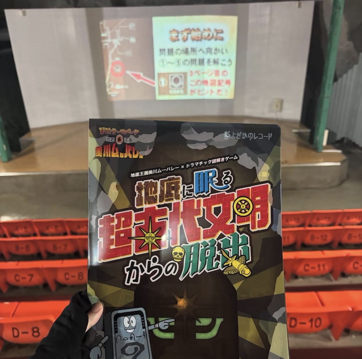 美川ムーバレーはただの洞窟探検ではなく、謎解きをしながら超古代文明から脱出する!という冒険テーマパーク。受付で暗号ノートをもらっていざ出発!