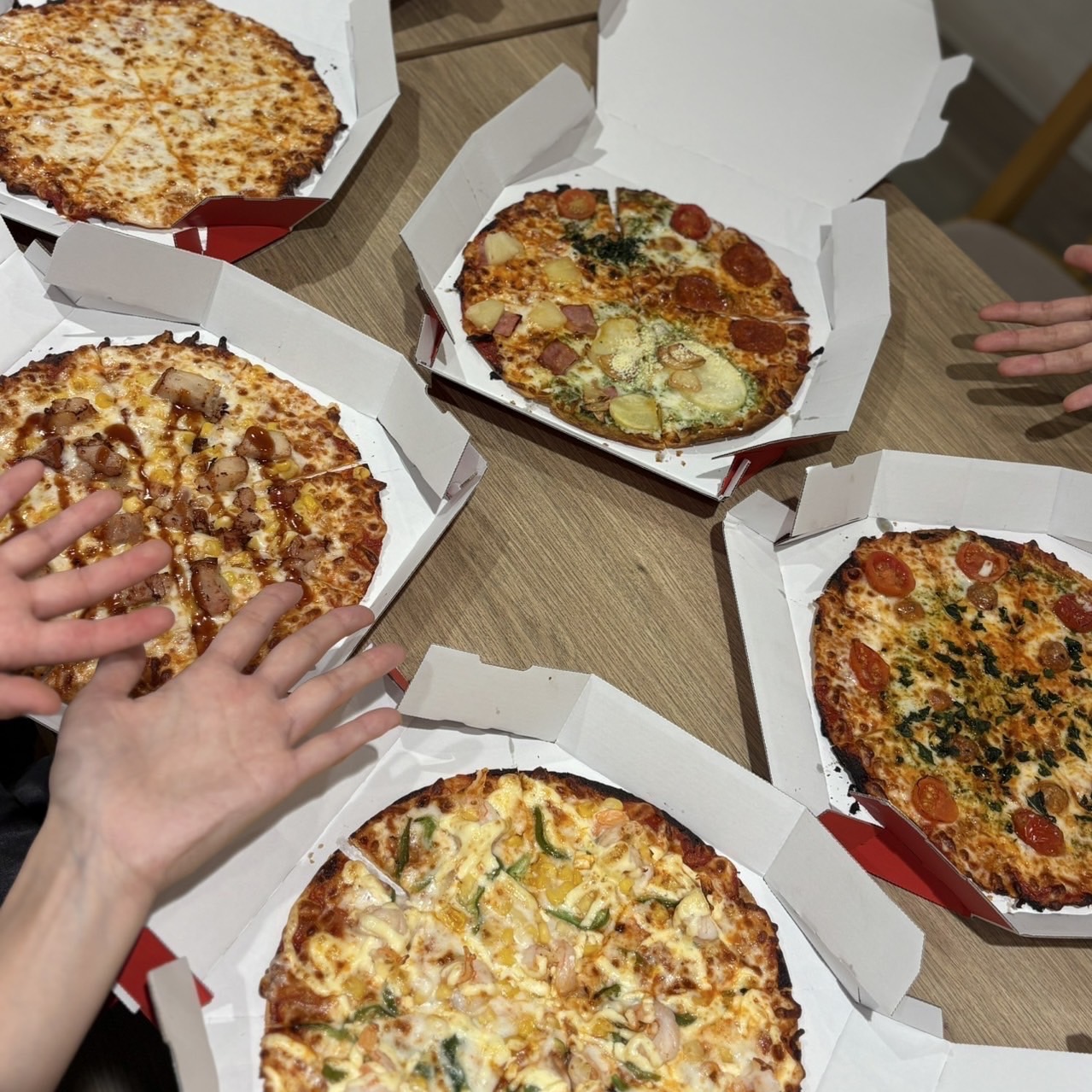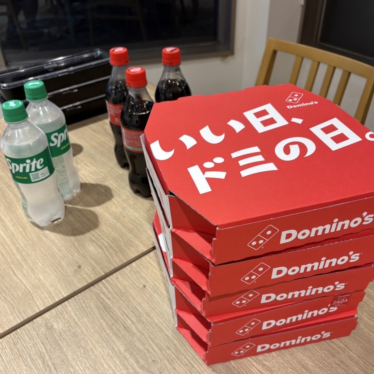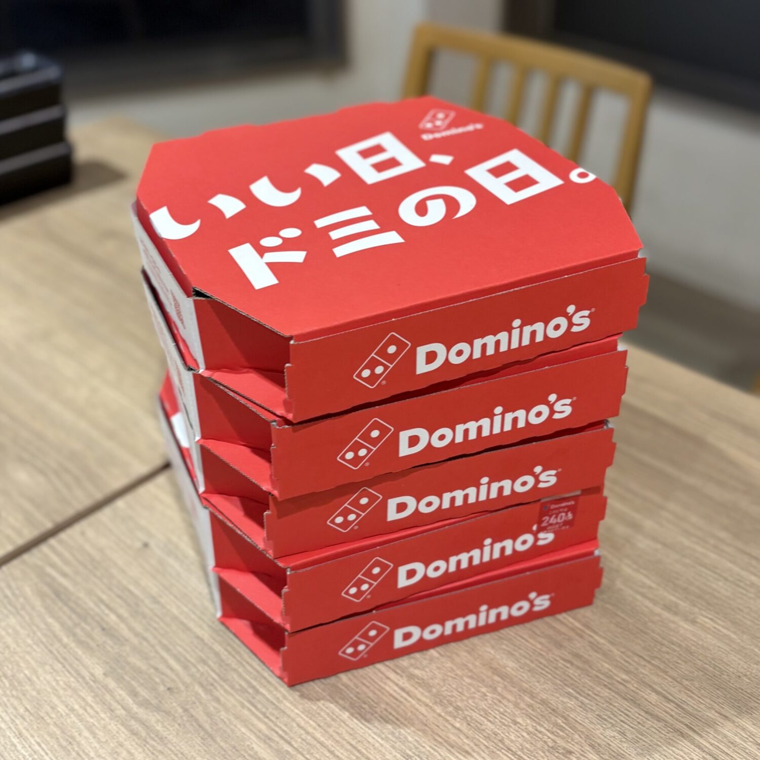 じゃーん!5人分5枚!5段重なったピザ箱〜🍕🍕🍕🍕🍕