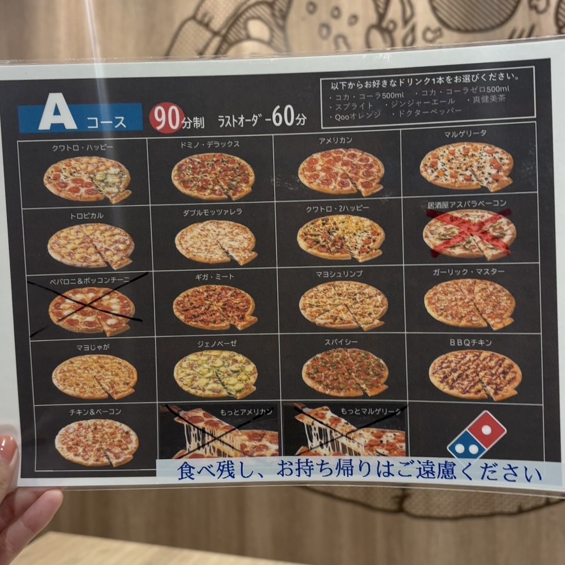 ドミノピザの食べ放題には3コース。時間は90分でラストオーダーは60分。