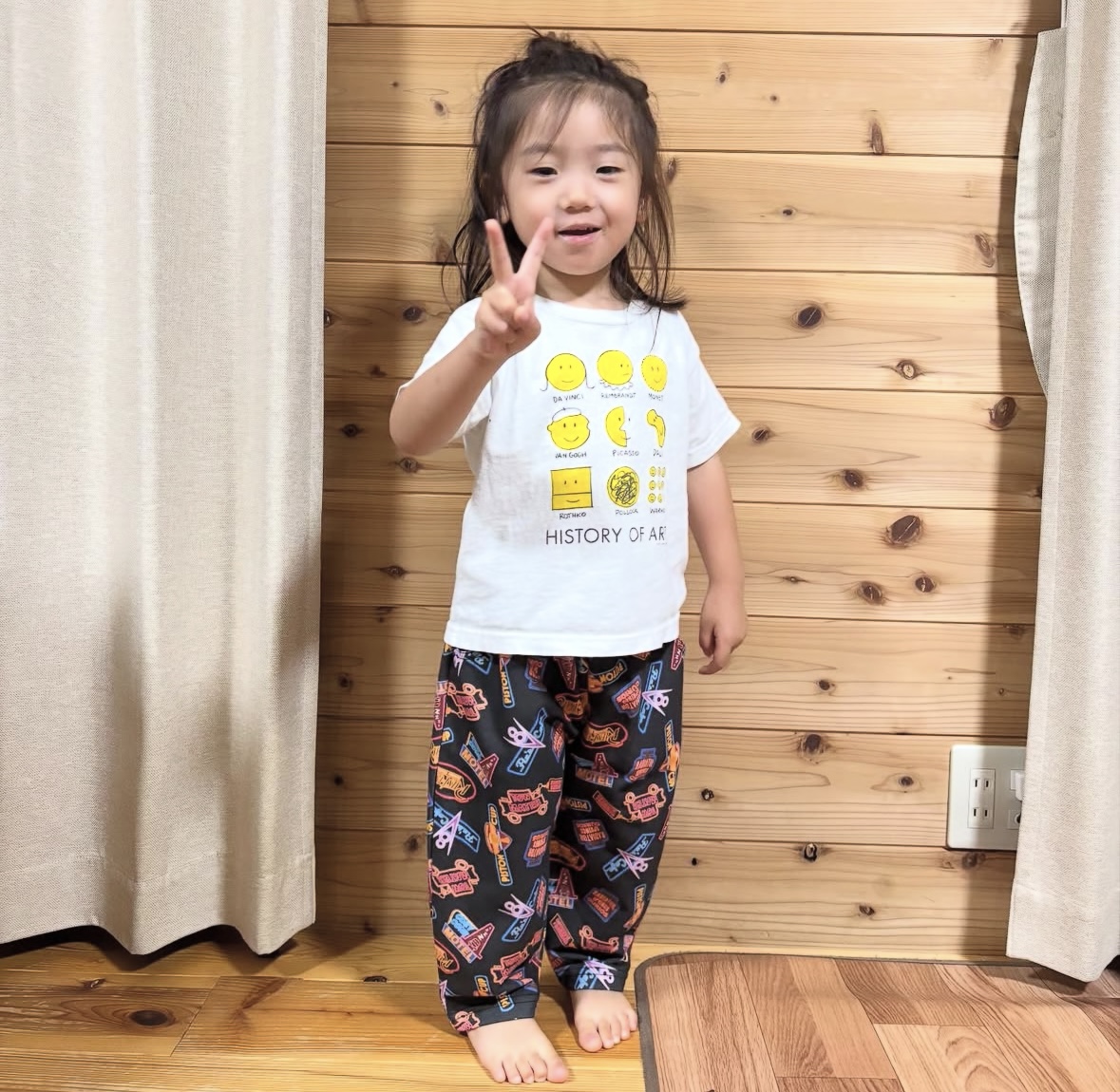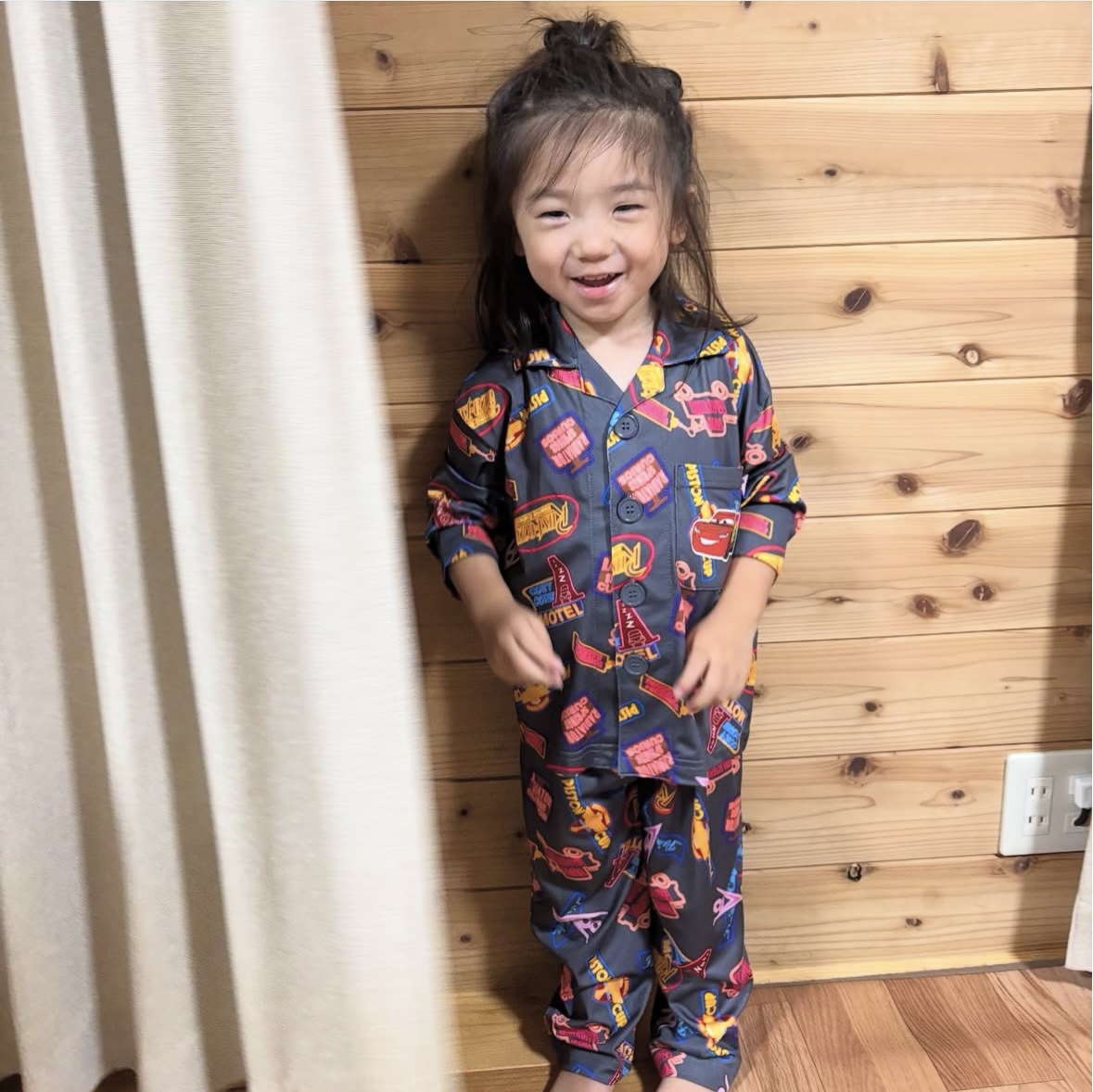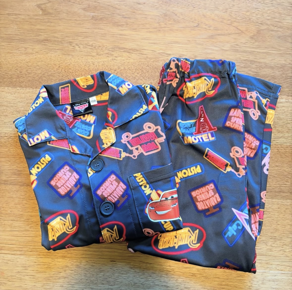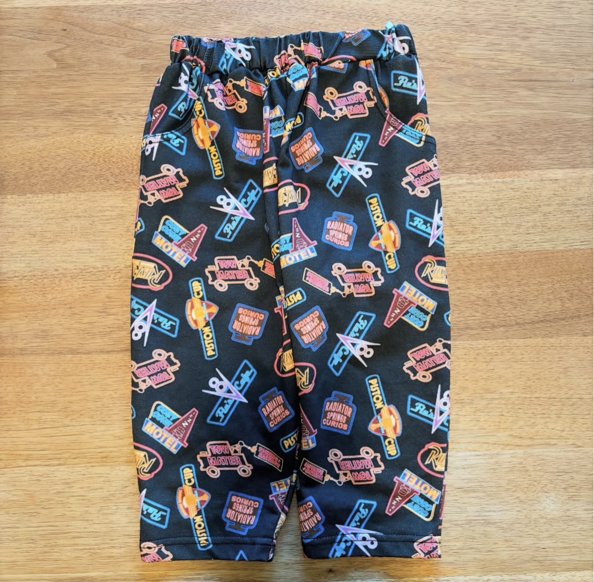 カーズの劇中に登場するネオンサインが描かれたパンツとパジャマ(上下セット)を発見してすぐさま確保!これはカーズ好きにはたまらん。マニアだけが気づけそうなネオン柄が可愛すぎます。ちなみに息子にマックイーンの付いていない面を見せましたが秒で気づいていました。さすが!!