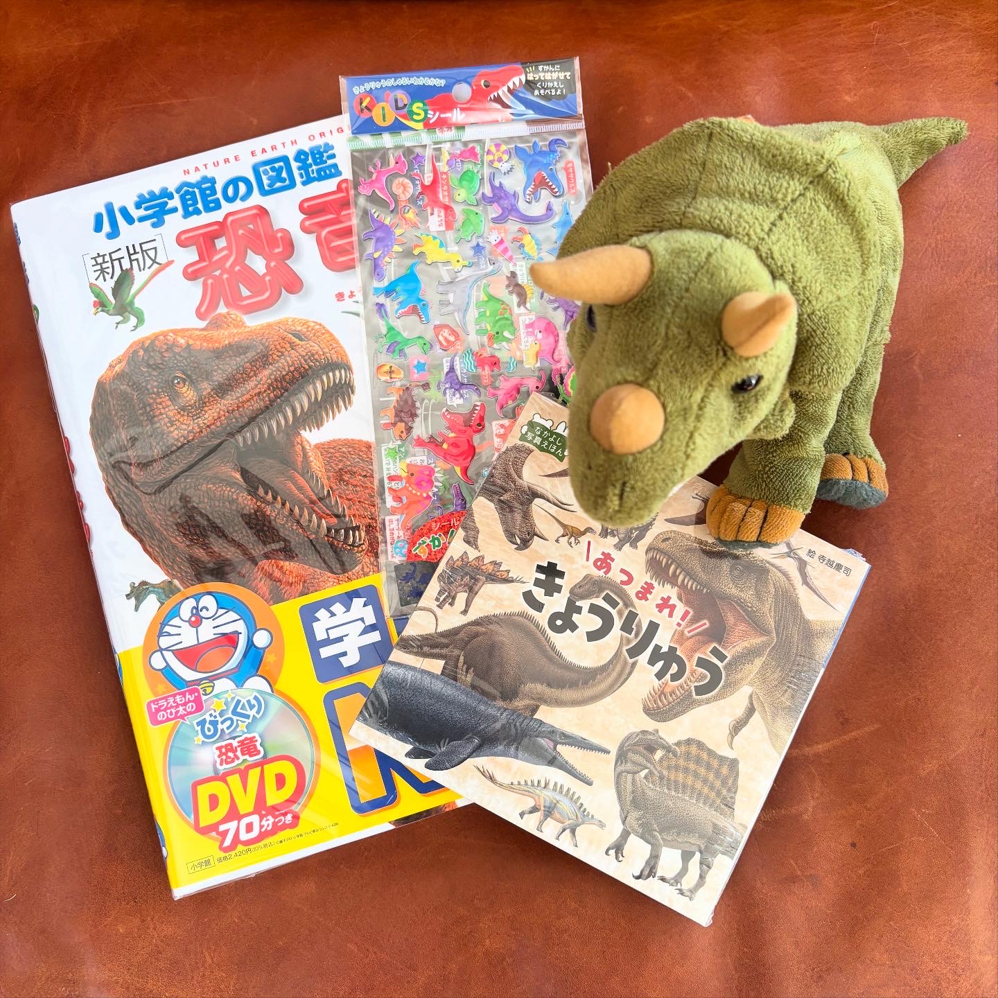 今年はみんなに恐竜グッズを買ってもらいました!ぬいぐるみや図鑑、持ち歩き用の本(なんでも持ち歩きたい男)大興奮でした。