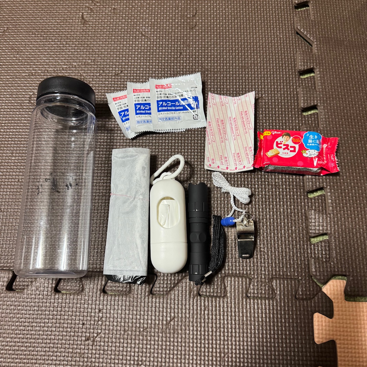 こちらは、透明の水筒に必要最低限のものだけ入れる防災グッズです!!