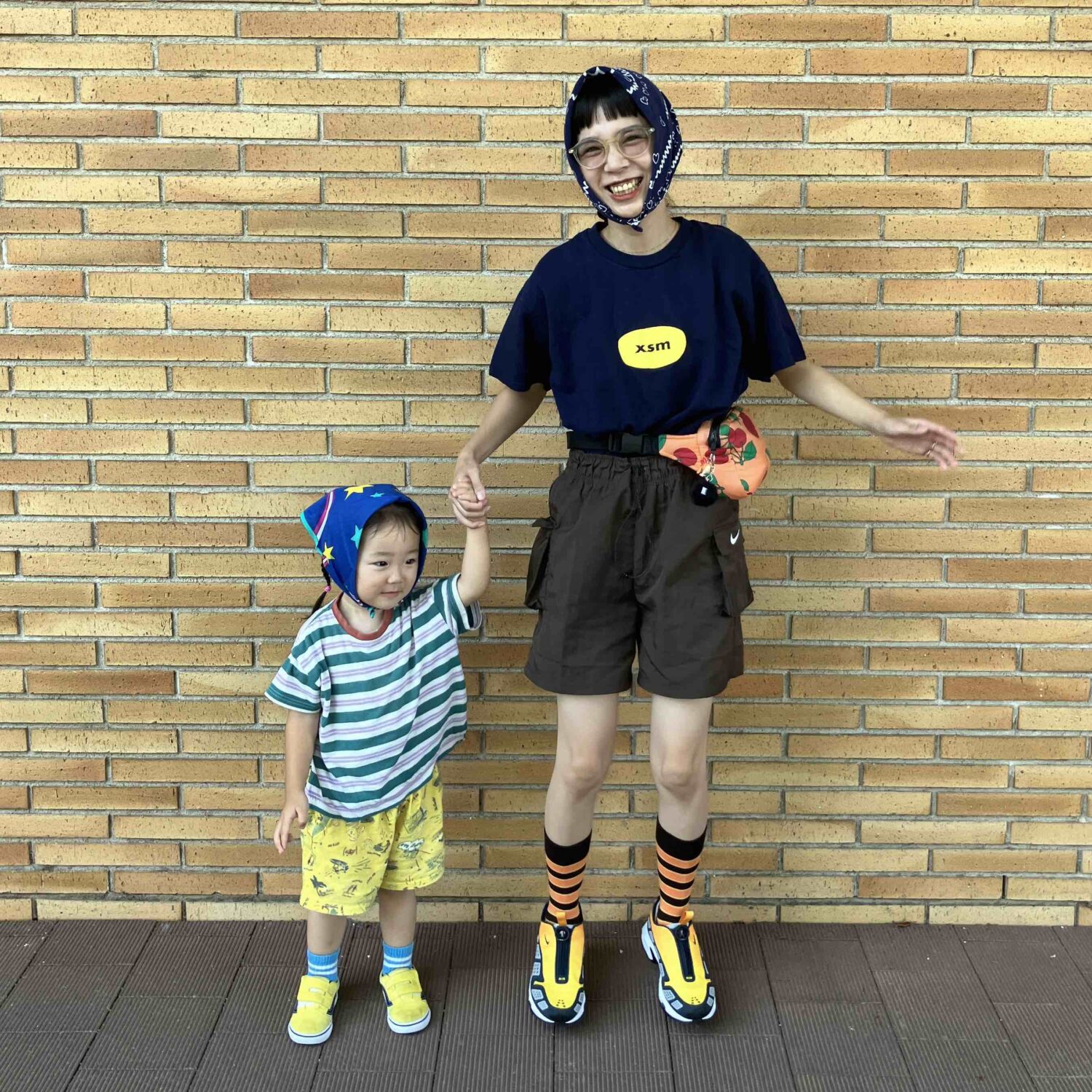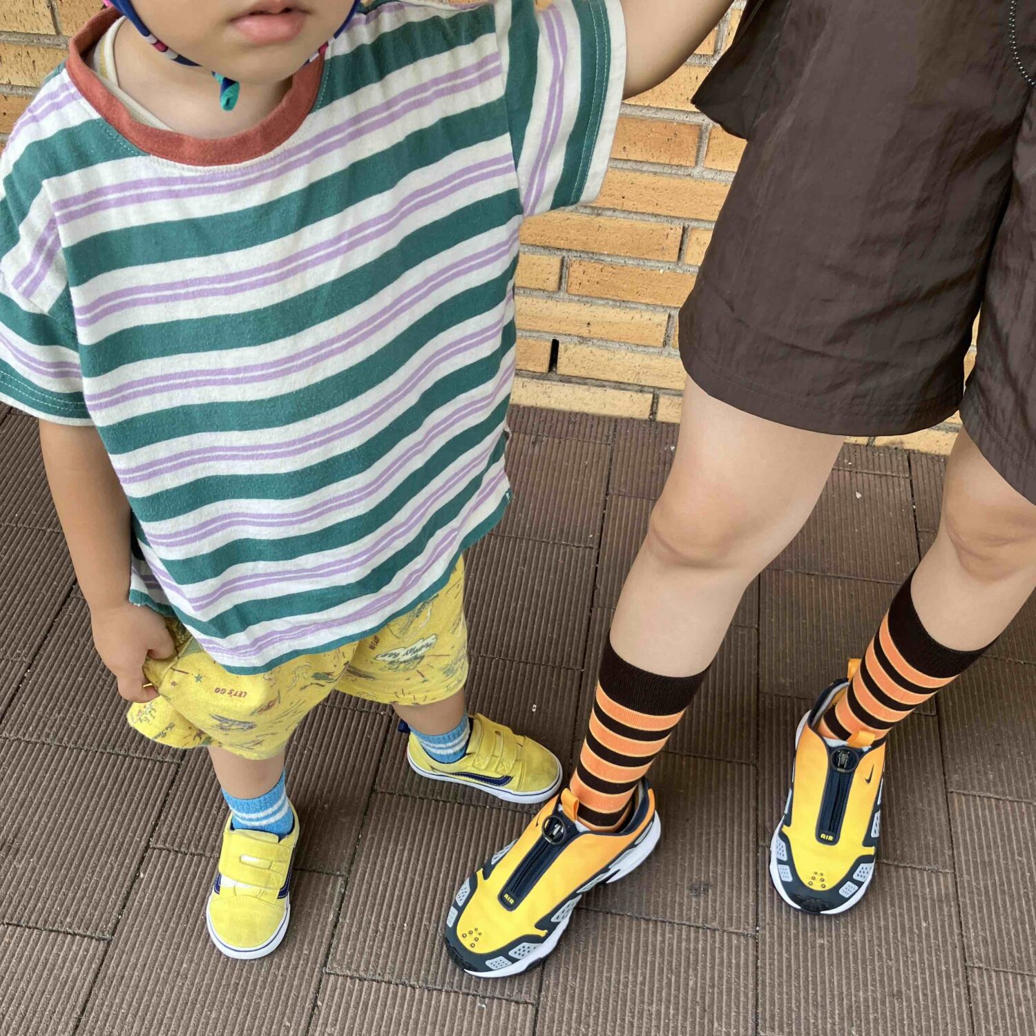 定番のボーダー柄などはアイテムを変えてお揃いにすると取り入れやすくなります。この日は子はボーダーのTシャツ、私はソックスにボーダーを入れました。柄のリンクが恥ずかしいななんて方はアイテムを揃えると全体的にまとまって見える気がします。今日我々はバンダナ、Tシャツ、ハーフパンツ、ソックス、スニーカーと使っているアイテムは全部一緒なのです〜〜〜!