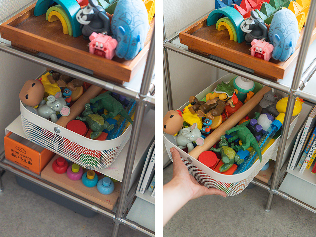 - 使い方:「小さいおもちゃはここだよ」と定位置を決めるだけで、子どもも覚えやすく、一緒に片づけしやすい。仕切りがざっくり仕分けを助けてくれる。