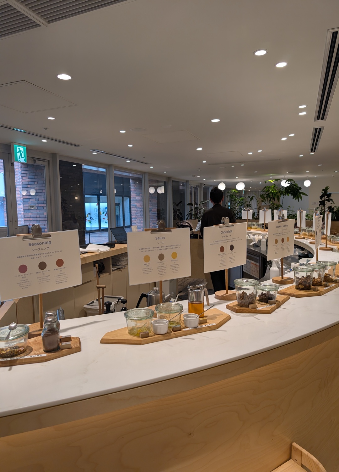 多彩なサステナブル食材から好きなものを選んで、サラダやアイスクリームをカスタマイズできるトッピングバー。