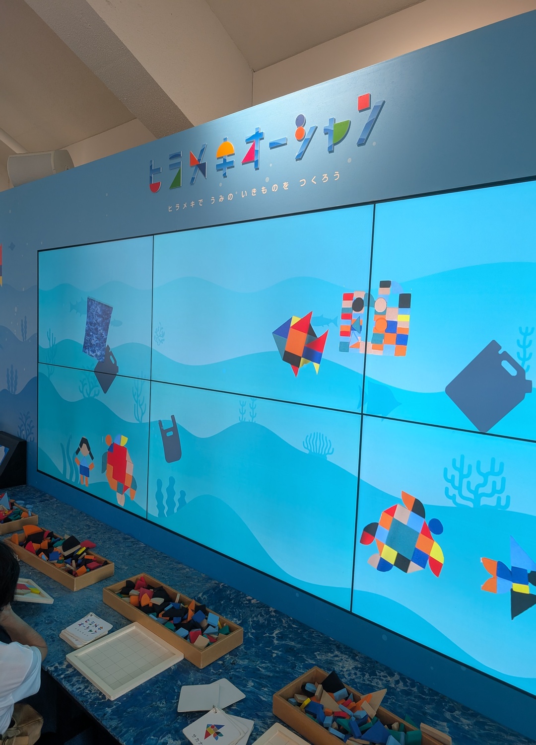 こどもたちが様々な種類のブロックを自由に組み合わせてつくった「海の生きもの」をスキャンすると、浮いていたプラスチックゴミが一つ消えて、きれいになった海へ生きものが泳ぎ出します。そんな体験ができるデジタルコンテンツです!