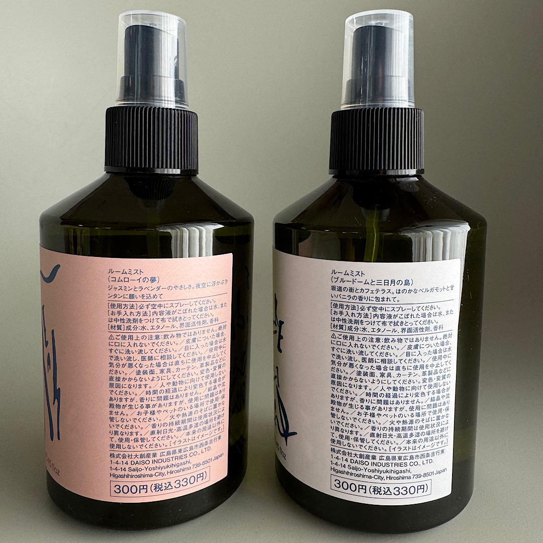 この見た目もお洒落なルームミストが330円だなんて見つけて2種類即買いでした。