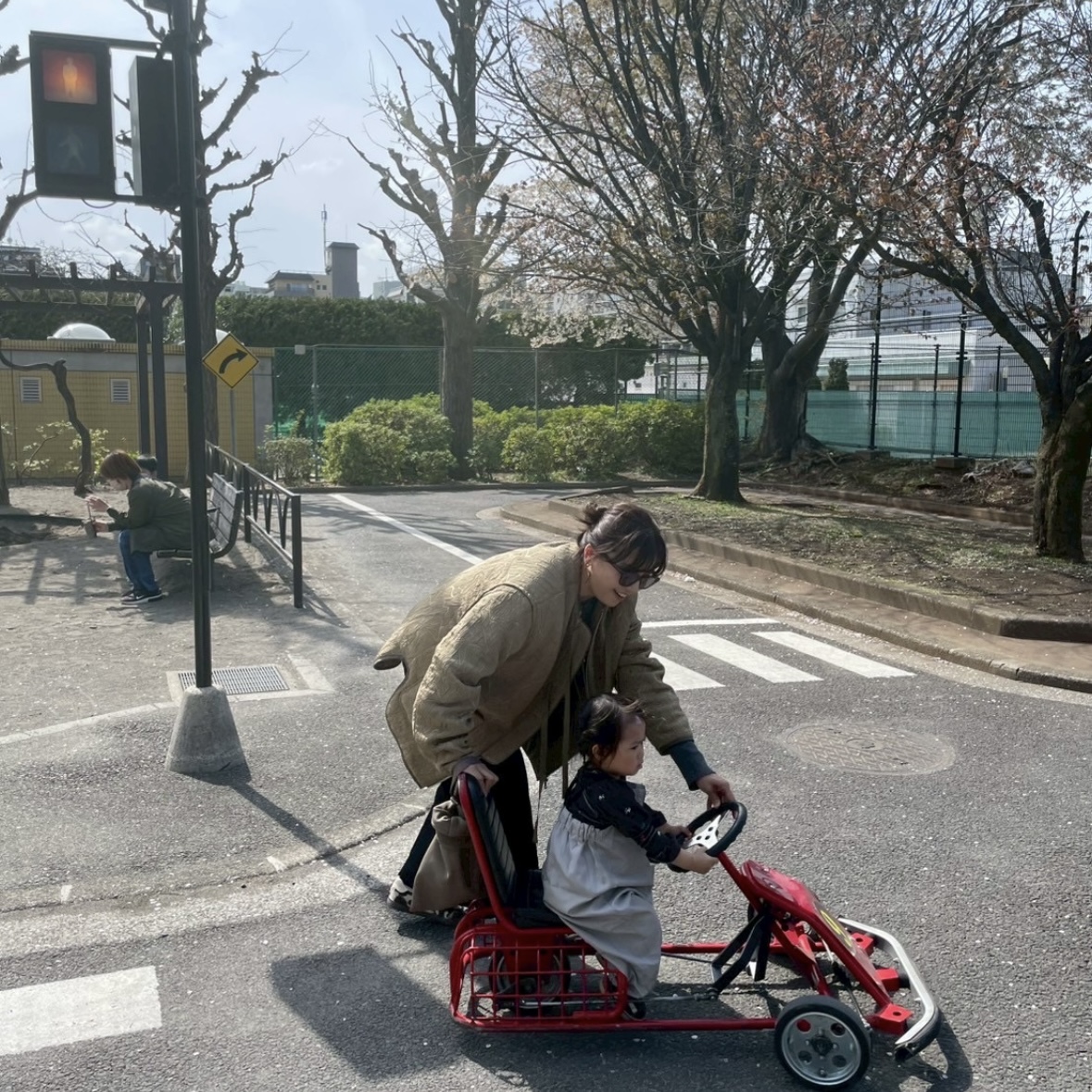 車道、歩道、信号機、横断歩道等が再現されている交通広場では幼児用カートを無料で楽しむことができます。2歳の長女にはまだレベルが高かったけど、私が後ろから押すことで運転している風に!笑