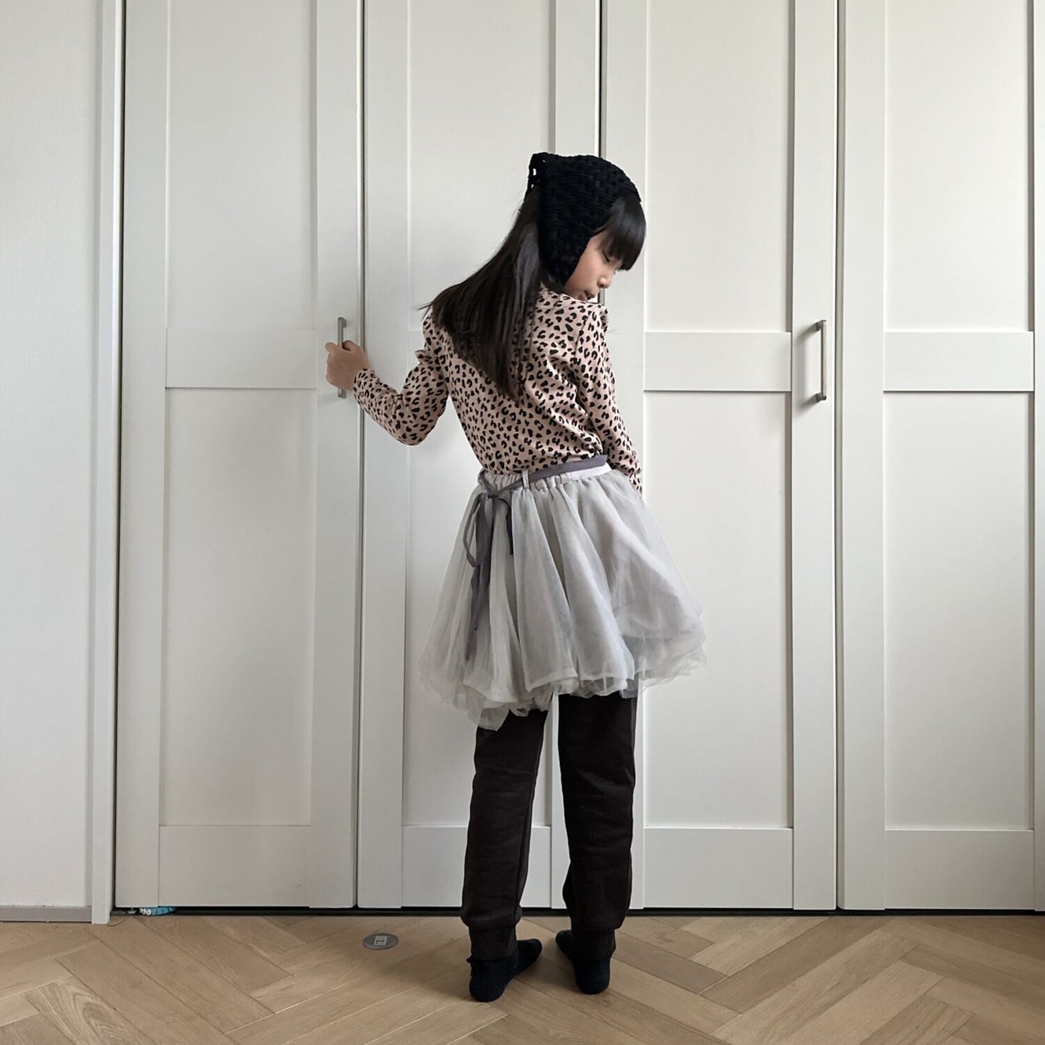 ブラウンのスウェットパンツと豹柄が相性バッチリ◎豹柄は主張が強かったのでチュールスカートでバランスをとりました!