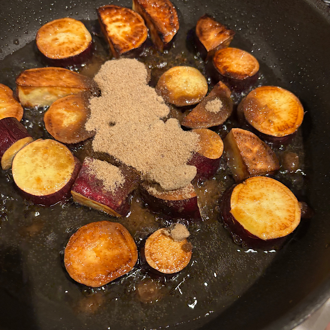 ③色が付いてきたらそのまま砂糖を入れて(小ぶりな芋ひとつに対して大さじ1.5ぐらいのイメージ)混ぜ混ぜ〜。少し粘り気が出来たら余分な油をキッチンペーパーで吸い取ります。