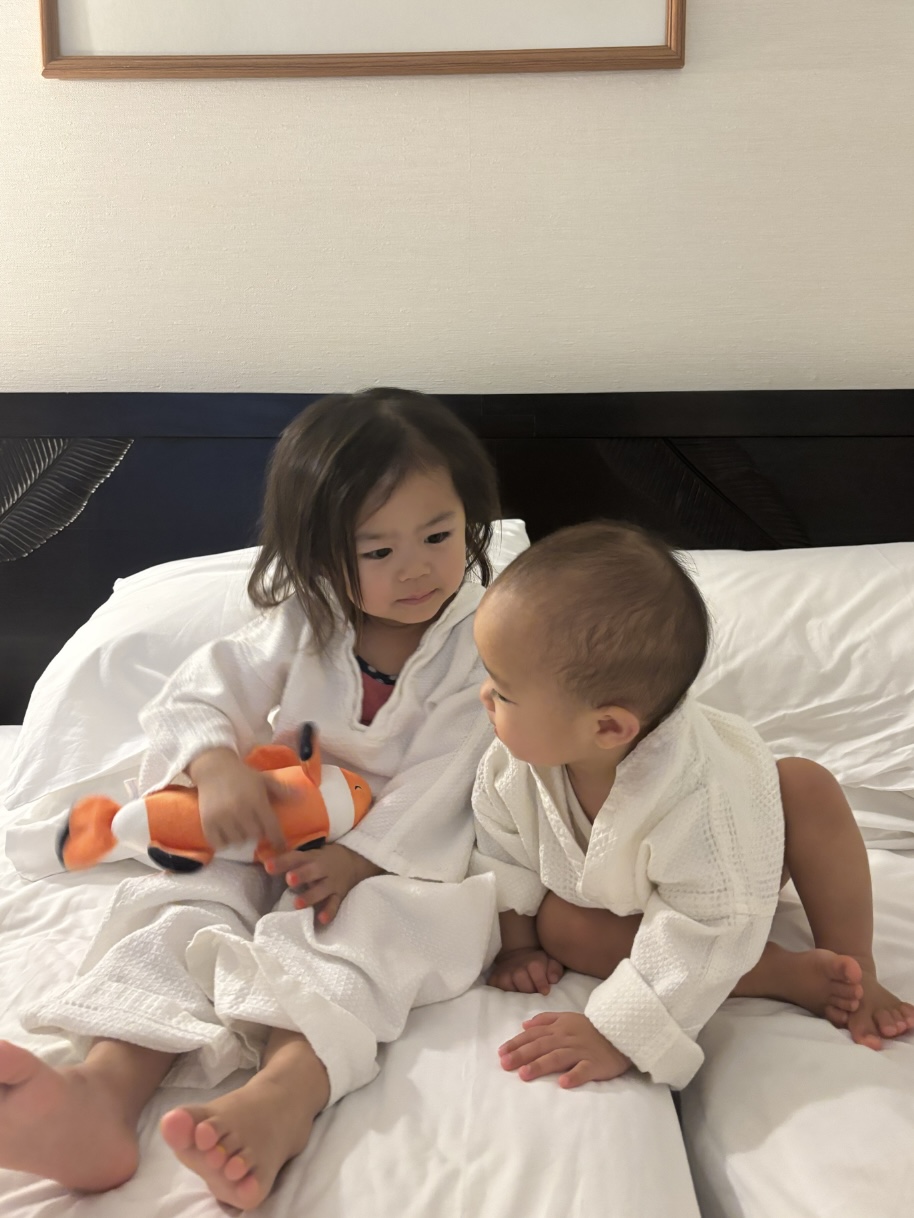 フロントにお願いすると子供用パジャマも用意してくださりました!家族4人でホテルのパジャマで写真も撮ったよ〜!