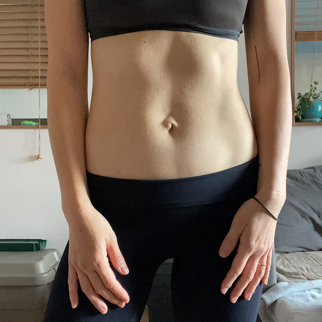 筋肉量が上がった事で、腹筋も縦線が入り、薄っすらと割れてきました!もちろん食べすぎたらポッコリお腹になるのですが、代謝も良くなった事で朝にはちゃんと排便があり、無理な食事制限はしていないのですが、このくらいをキープできるようになりました😊