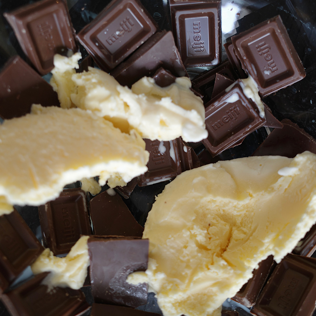 ①チョコ2枚を細かく割り、バニラアイス半分よりすこし多めを混ぜて