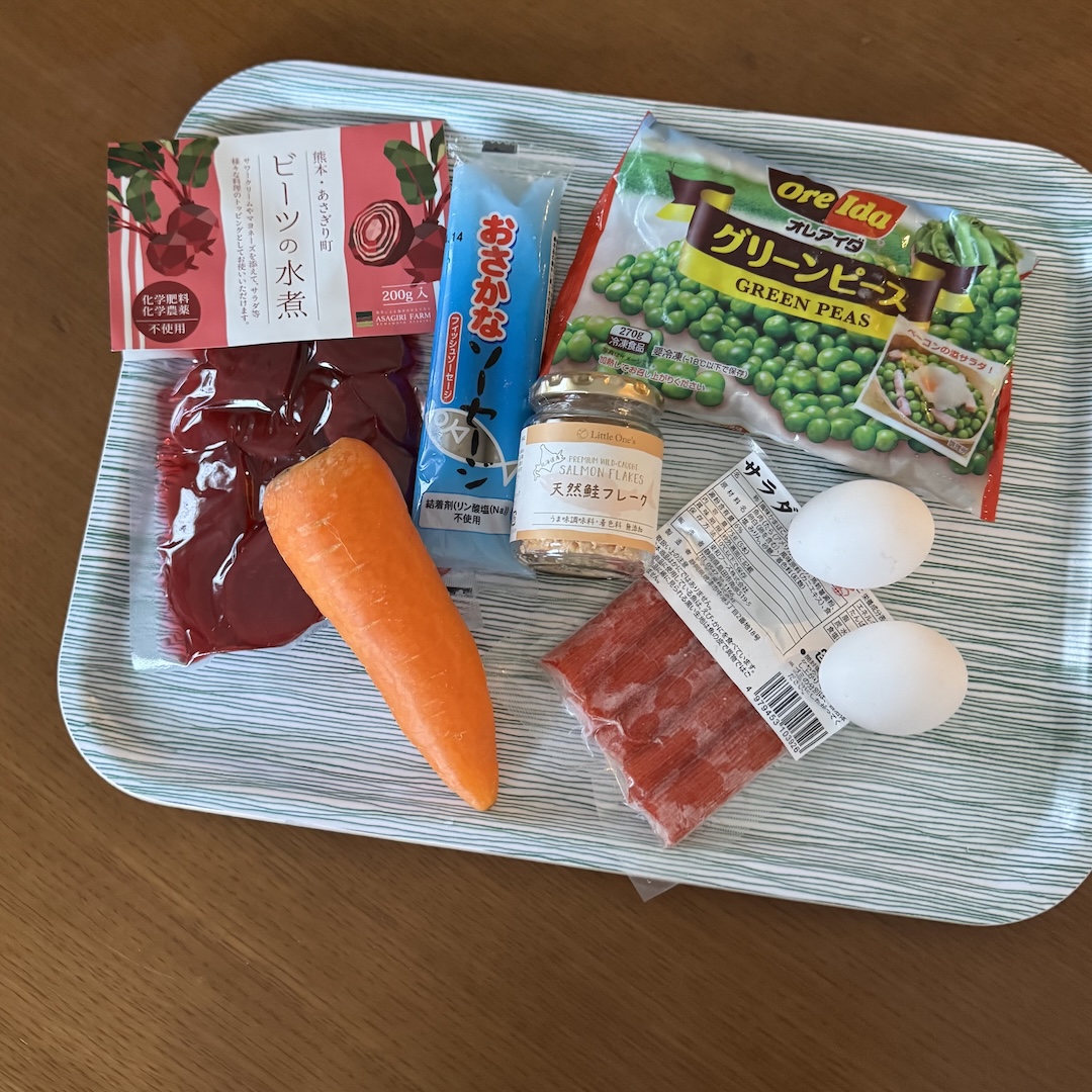 材料は、にんじん、卵、グリンピース、ご飯、鮭フレーク、ビーツ、魚肉ソーセージ、カニカマ。