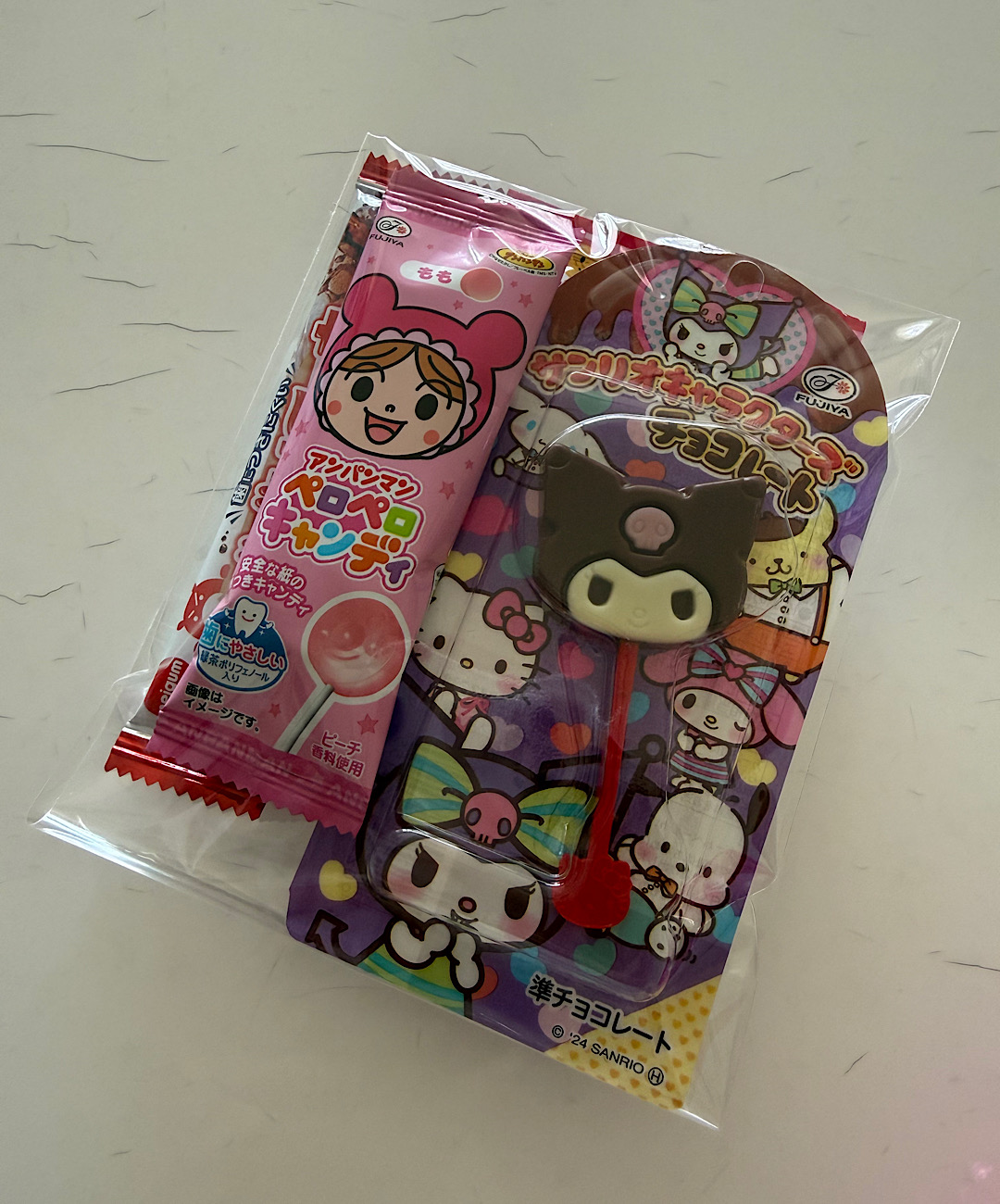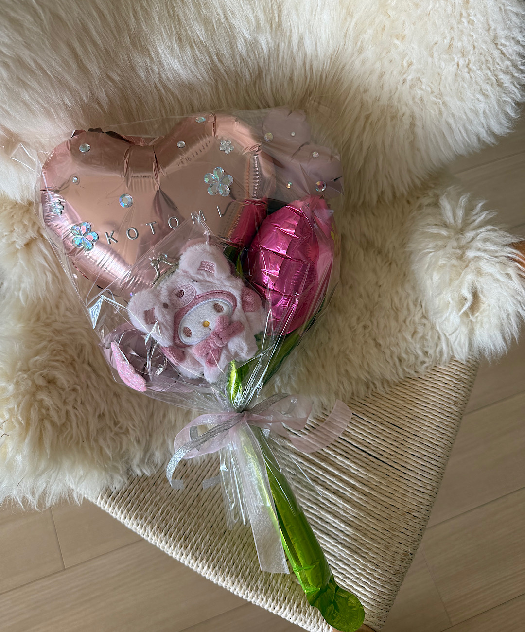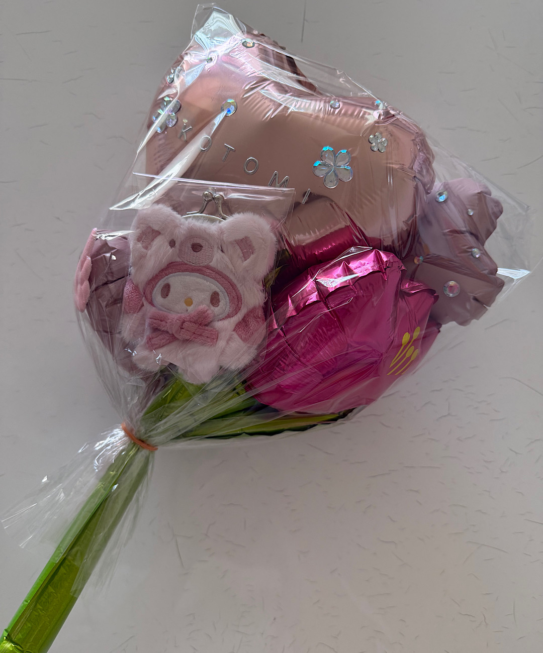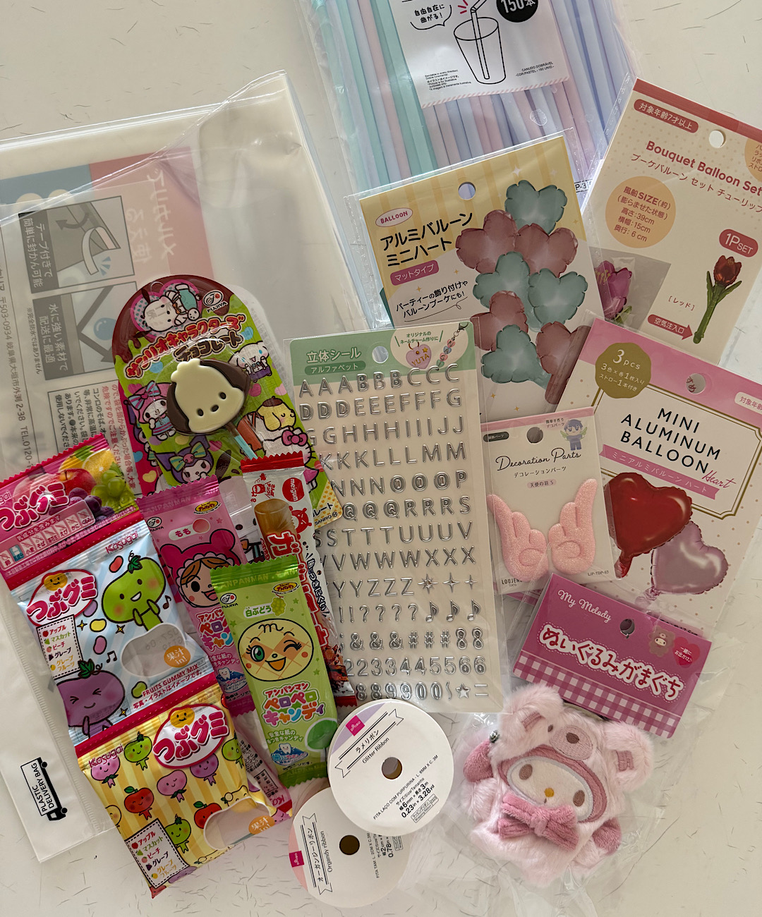 それにプラスで、家にあったストローと、バルーンの色味に合わせて雑貨屋さんでマイメロちゃんのぬいぐるみがまぐちをプレゼントで用意しました♡