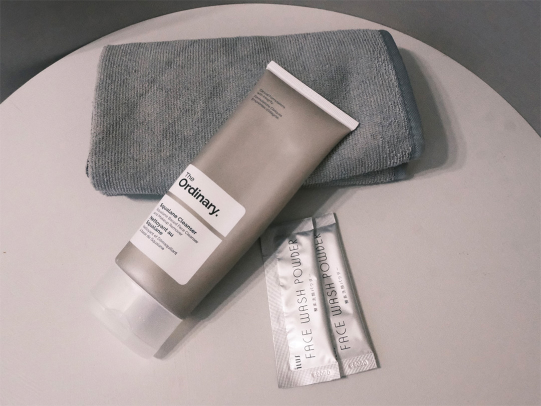 普通のタオル…… でも、地味に結構大事だと思って。イギリスだとお水が硬いので、コットンタオルだとパリパリになってしまう。Amazonとかで買えるマイクロファイバーのタオルが、やわらかくて肌をこすらずに顔にぱっと当てるだけで一瞬で拭けるので、好きです。