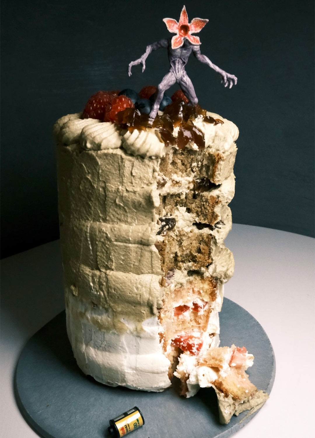 クリスマスにつくった、デモゴルゴンのほうじ茶ケーキ。娘がガチャポンで当てた。あっちの世界とこっちの世界を表現してみました……(笑)。クリームの隙間にほうじ茶ゼリーいれると結構おいしい ↓