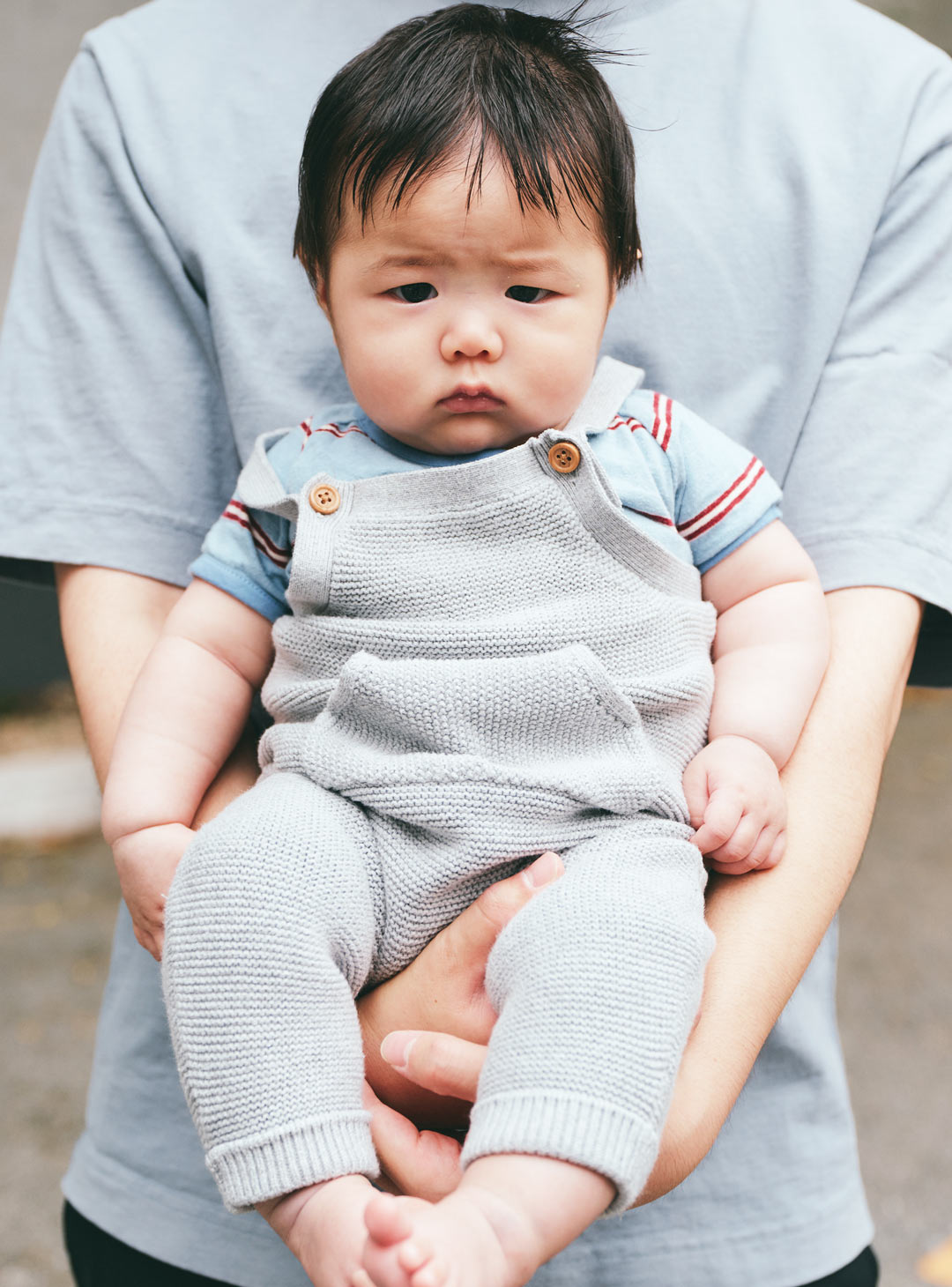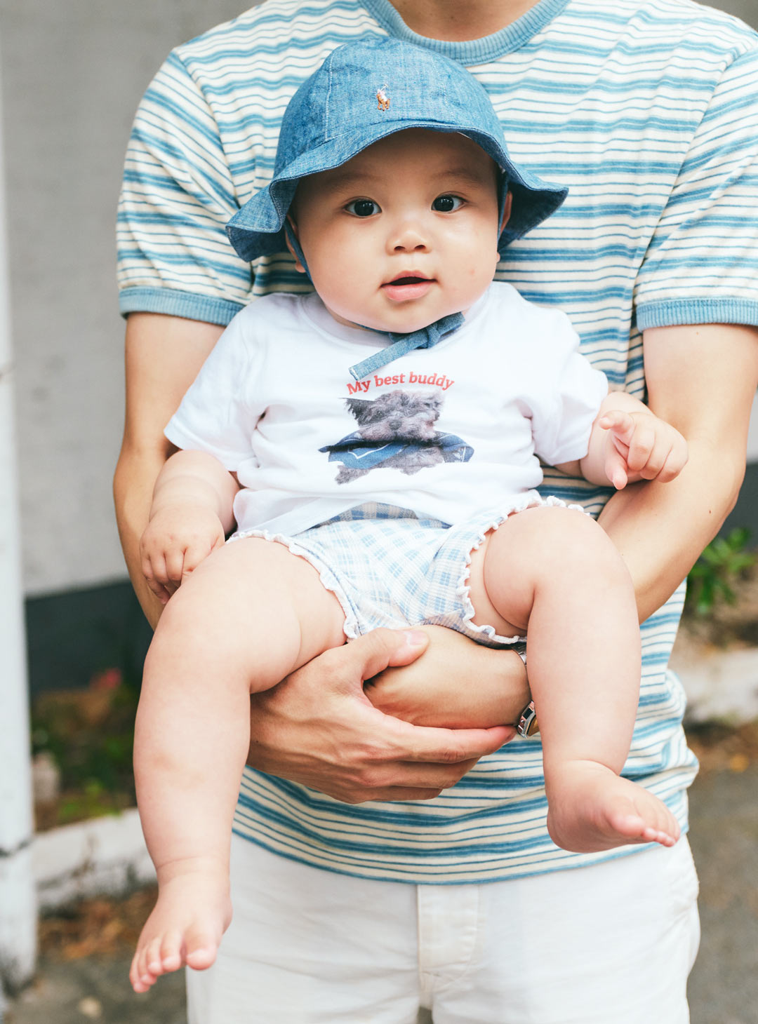 ナチュラルなウッドボタンが目を引くロンパースを主役にしたアルくん。インナーにあえてストライプ柄のTシャツを合わせて、こなれ感をプラス。マリン風のストライプとコットン素材の軽やかさが相まって、夏にぴったりの涼しげコーデが完成。