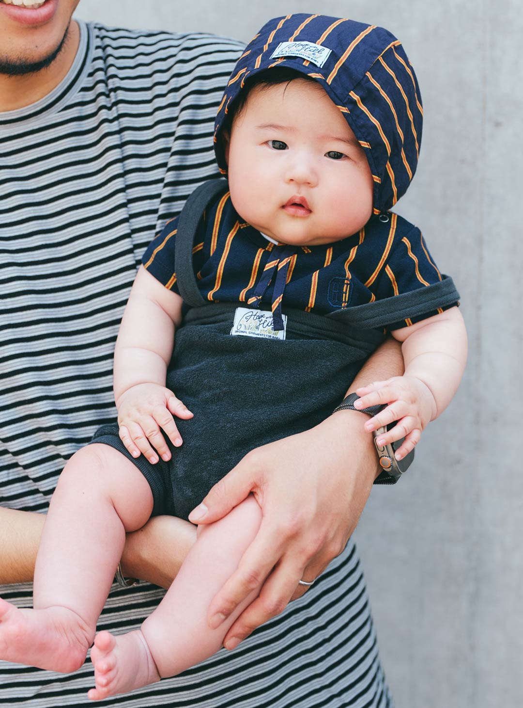 肌触りの抜群のパイル地のロンパースに、ストライプ柄のトップスをレイヤード。そこに、お揃いのボンネットも合わせて、全身『ハウス オン ザ ヒル』でキメたHibitoくん。重たく見えがちな夏の黒もストライプ柄を仕込むことで、一気に涼しげ&今っぽい雰囲気に。