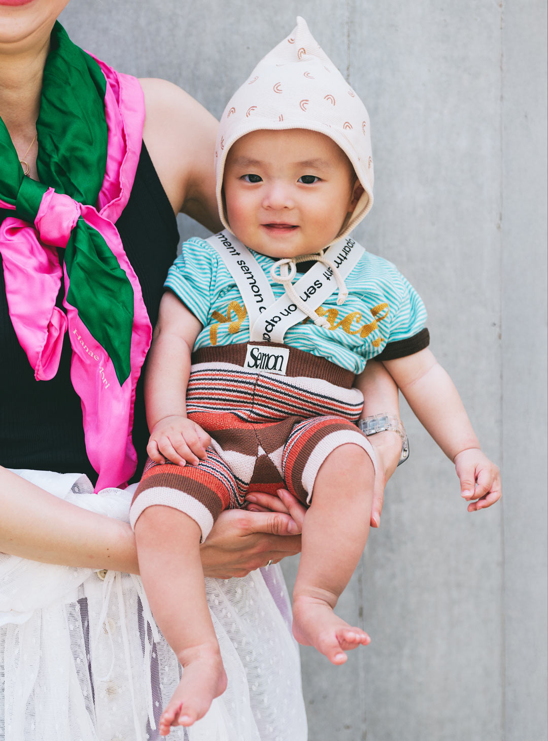 トップスとパンツを異なるストライプ柄で繋いだ、ストライプonストライプの上級MIXコーデ。ボトムには『セモンアパートメント』のロゴ入りサスペンダーがついたニットパンツを合わせて、ベビーらしい遊び心もプラス。どんなコーデにも合わせやすい白の柄ハットをかぶってバランスよく仕上げて。