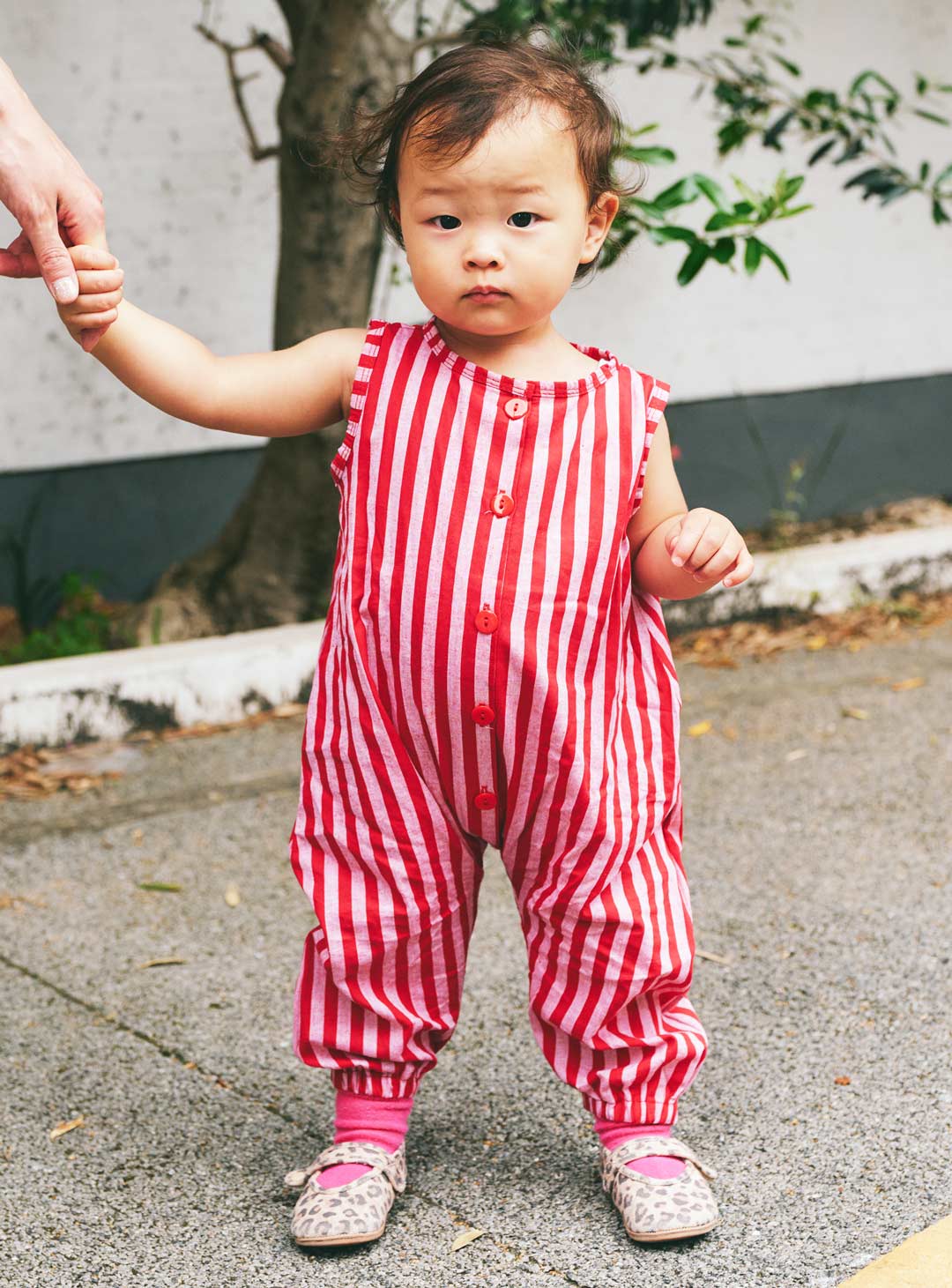 まるでぺろぺろキャンディのような甘カラフルなロンパースは、ニュージーランド生まれの『ベル アンド ボウ』のもの。赤とピンクのストライプが夏の街中にも映え、1枚でサマになる。靴下もピンクで合わせれば、可愛いピンクコーデの出来上がり♡
