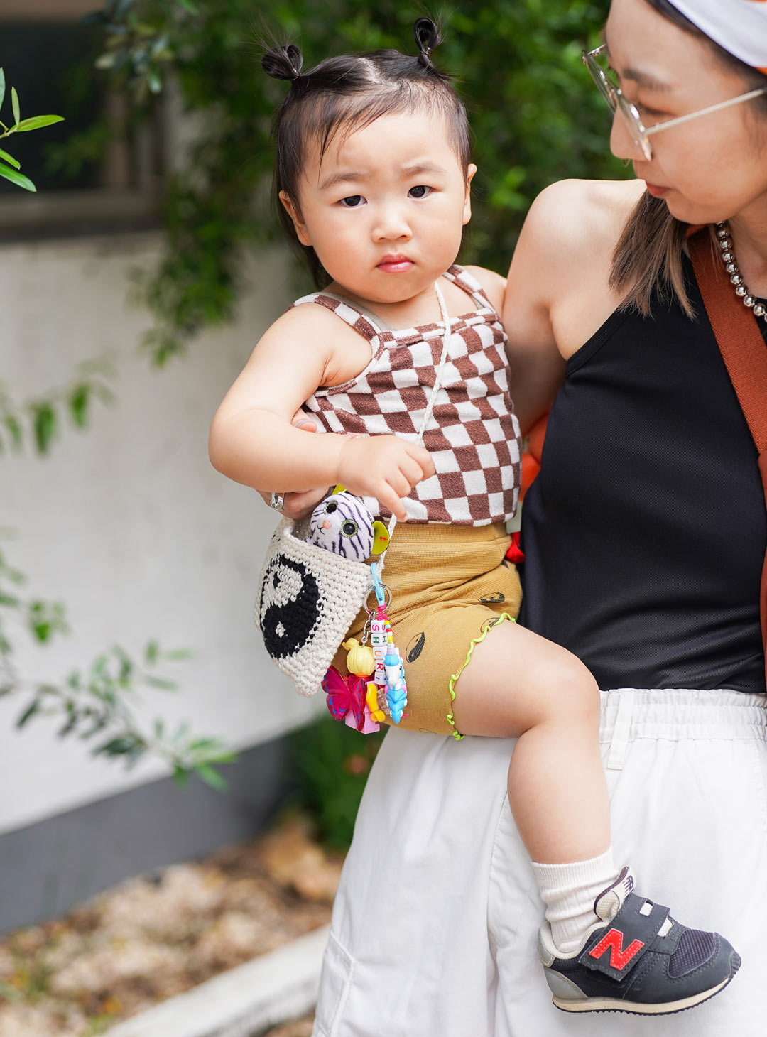 キュートなチェッカー柄のキャミソールがとってもお似合いなしゅりちゃん。ボトムと手づくりバッグには、陰陽モチーフがちりばめられていて、思わず目を引く遊び心たっぷりなスタイル。お手製バッグのなかにはお気に入りのぬいぐるみを忍ばせて、チャームをじゃらづけするのが、しゅりちゃん流♡