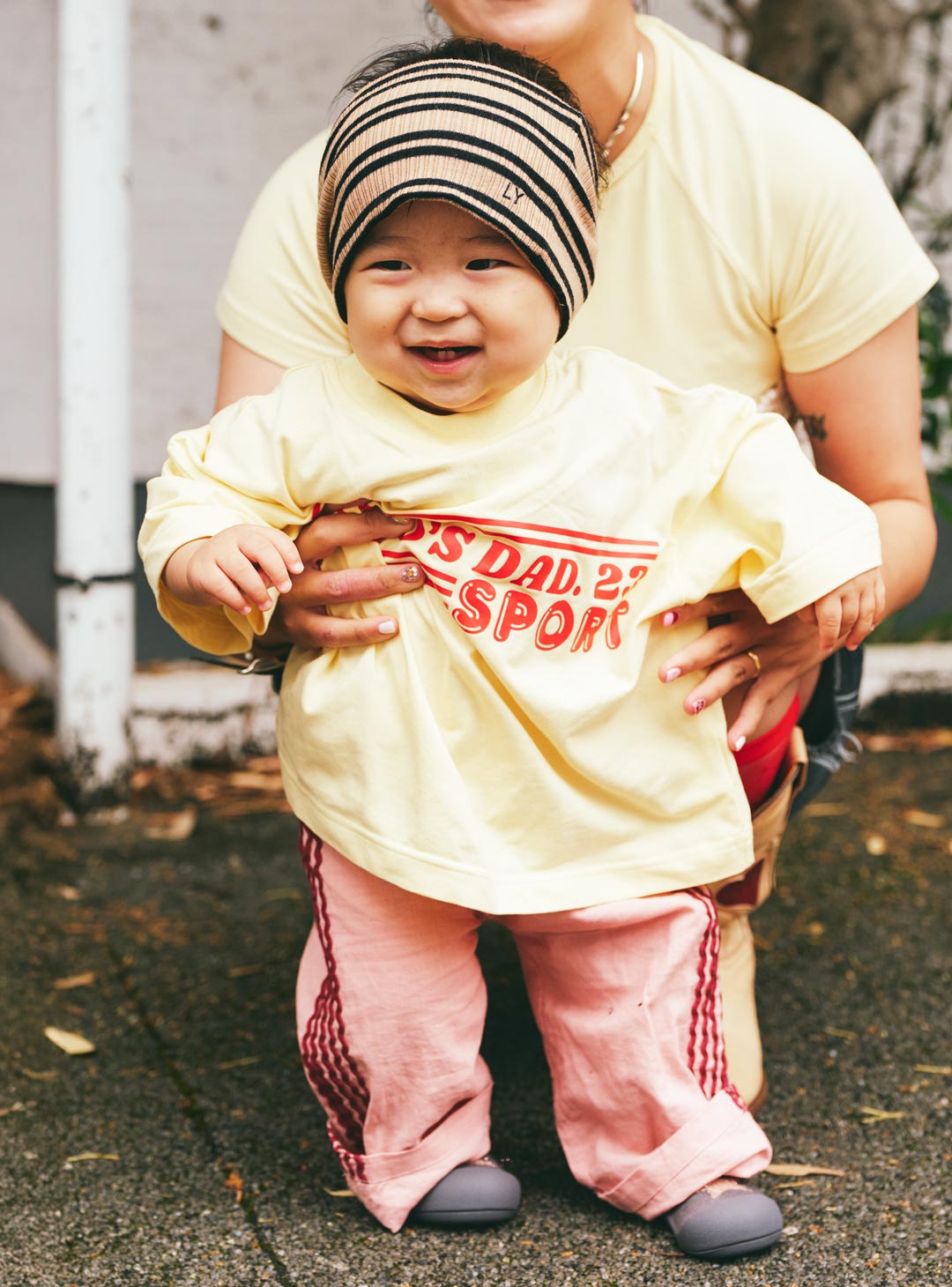 レトロポップなメッセージが刻まれたTシャツに、ライン入りボトムを合わせてスポーツミックスを堪能中のミトくん。頭に巻いたターバンがヤンチャ感を加速。自慢のイエローTは、ママのTシャツともカラーをリンクさせてお揃いコーデに。