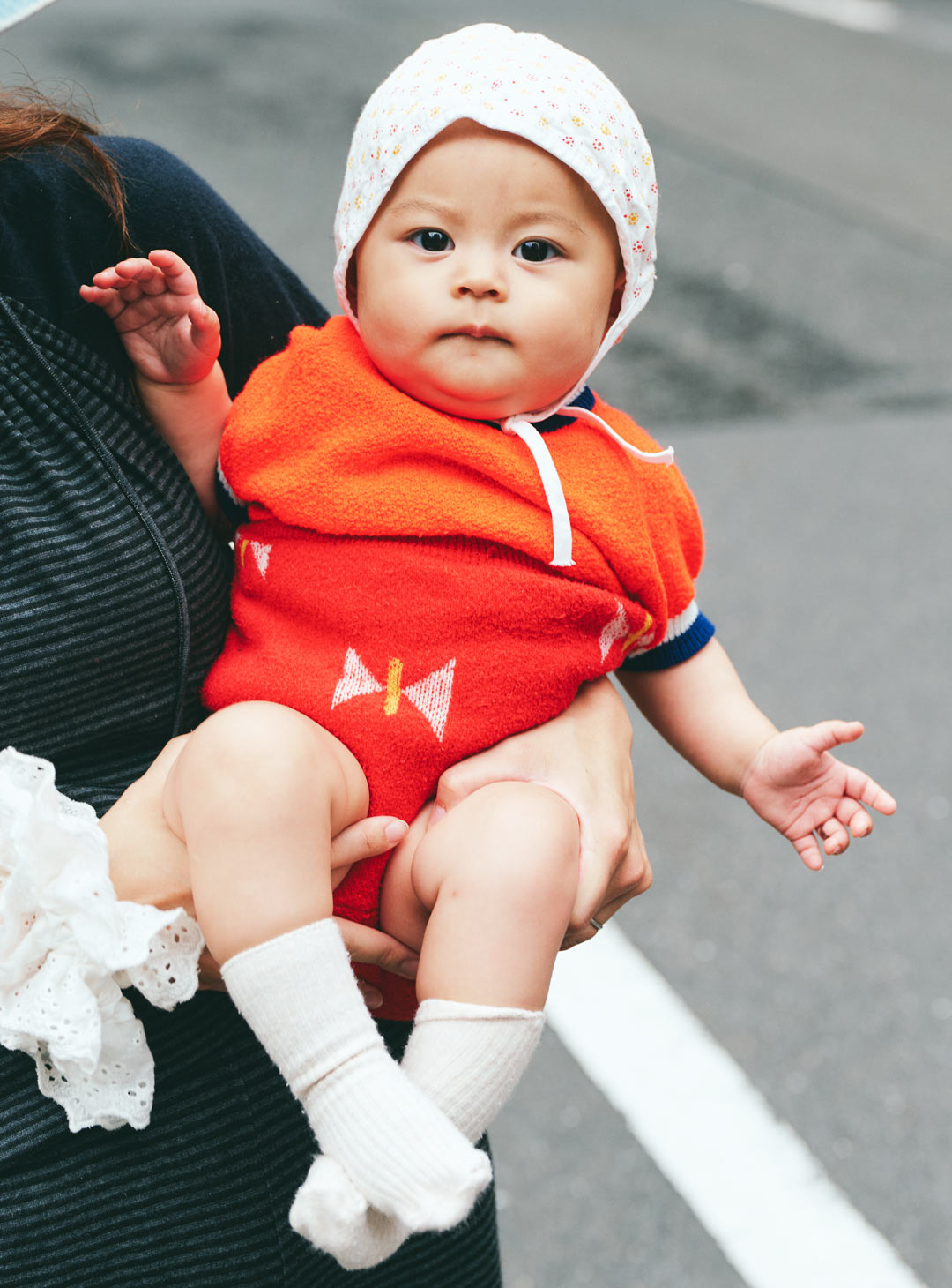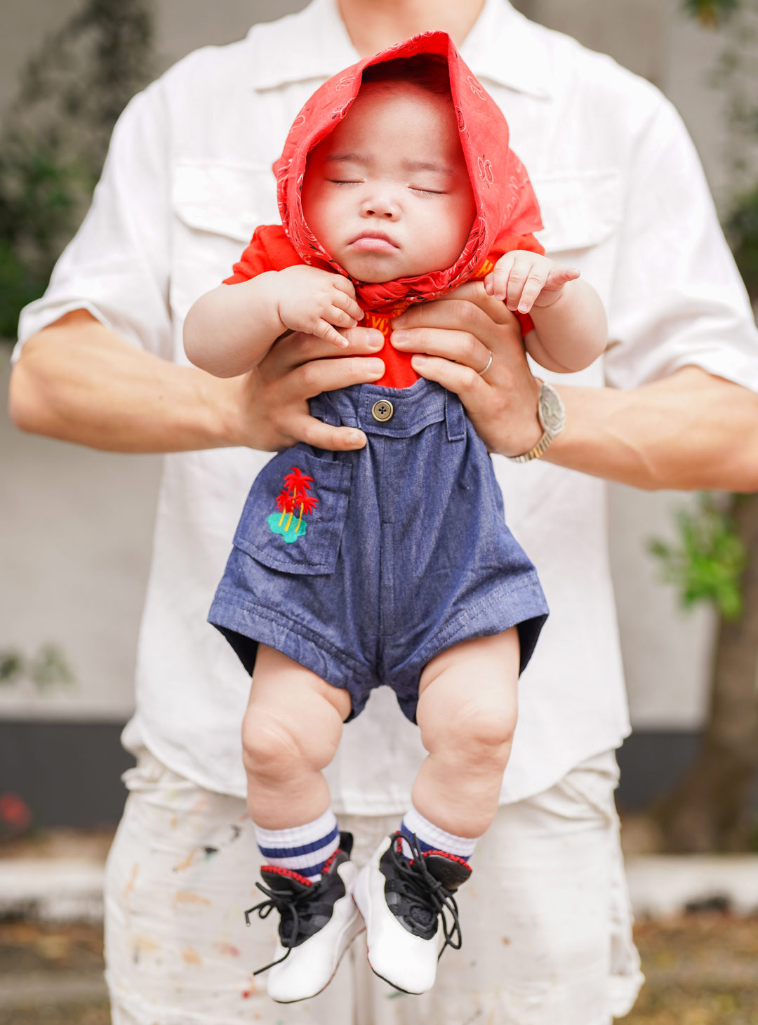 「スナップ? 寝かせてくれよ〜」と心の声が聞こえてきそうな、マイペースな息子っちくん。デニムライクなやわらかいボトムに、元気な赤トップスを合わせて。顔周りには、バンダナを巻いて可愛らしさを演出。スニーカーとラインソックスで、ほんのりスポーティに仕上げたカジュアルスタイル。