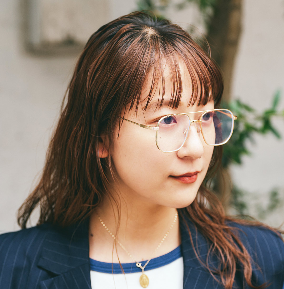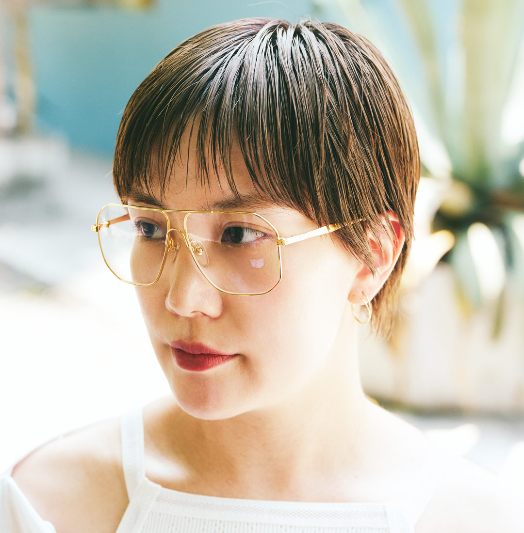 Tシャツ×ジレやパンツ×スカートなど、レイヤードスタイルが得意なかりんさんが愛用しているのは『ビームスボーイ』のダブルリッジメガネ。顔周りに華やかさを添えるゴールドの細フレームがコーデをさりげなく格上げ。夏気分を盛り上げる鮮やかなイエローバッグもアクセント!
