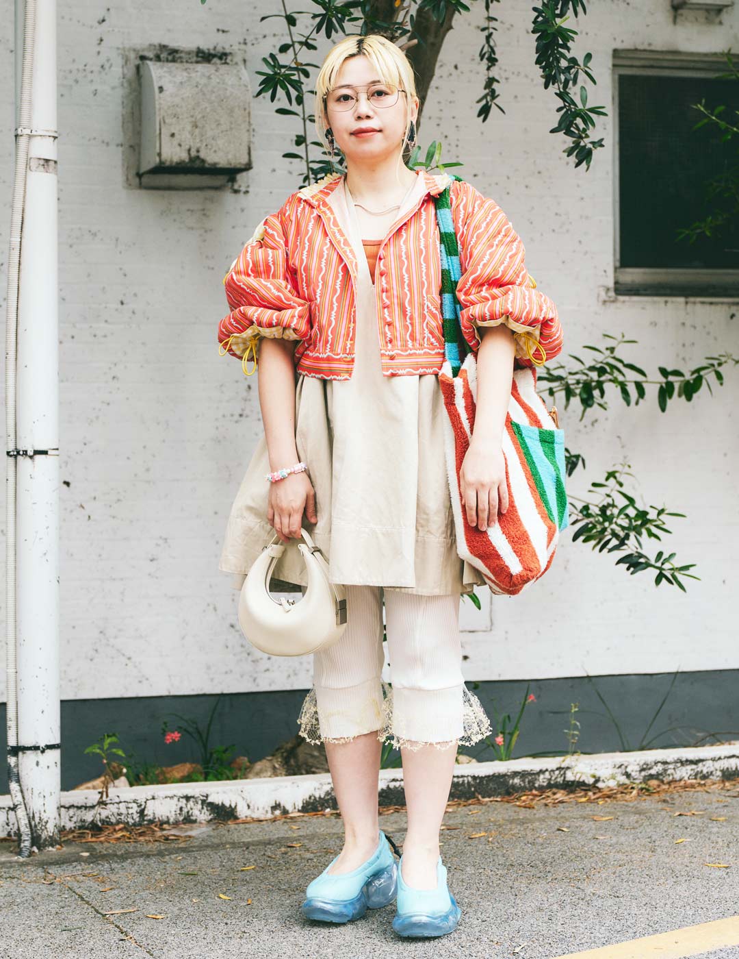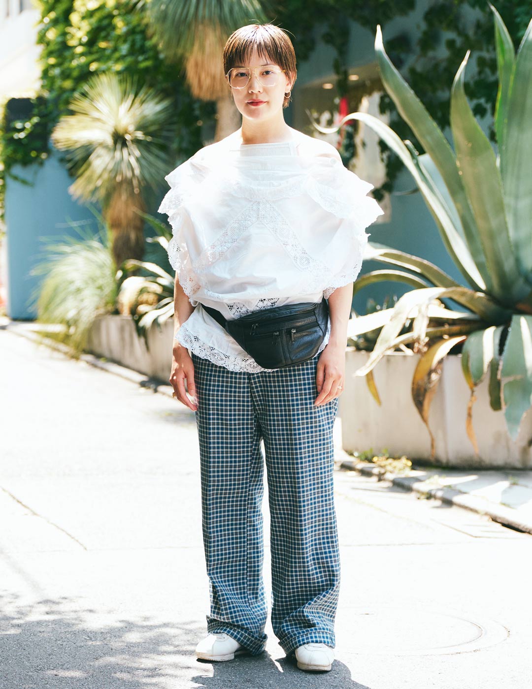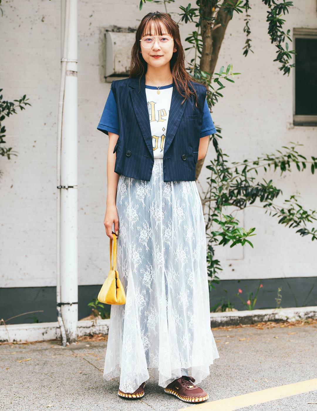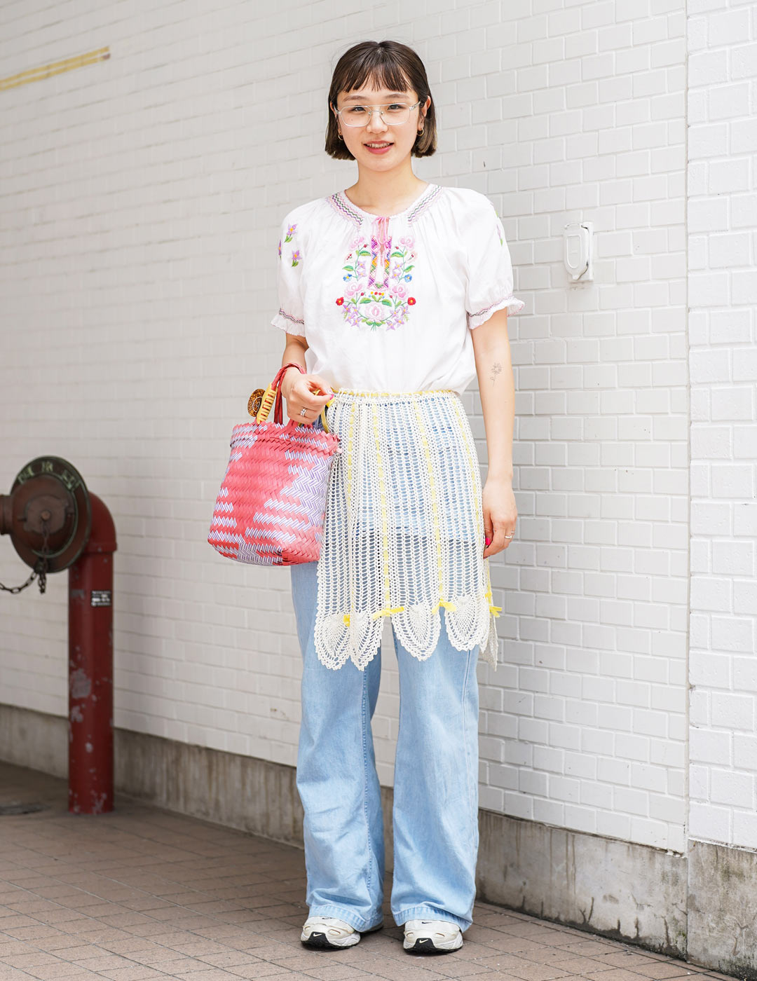 刺しゅうトップス、レースのラップスカート、パサールバッグで、クラフト感たっぷりのアイテムをバランスよく着こなしたsakuraさん。仕上げにシルバーフレームのダブルリッジメガネを添えて、全体をきゅっと引き締めれば、洗練された雰囲気が完成。