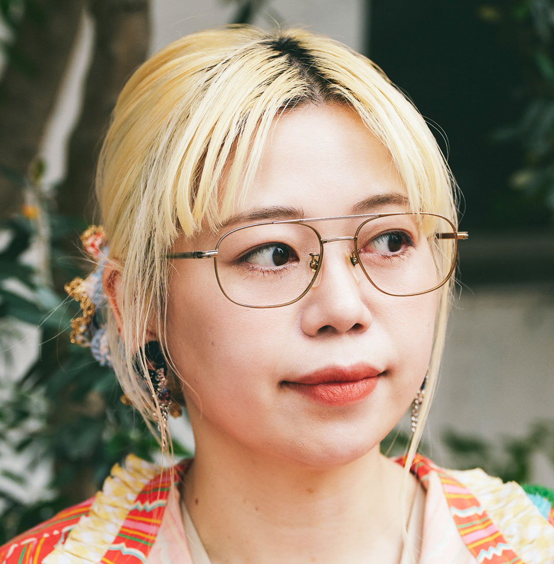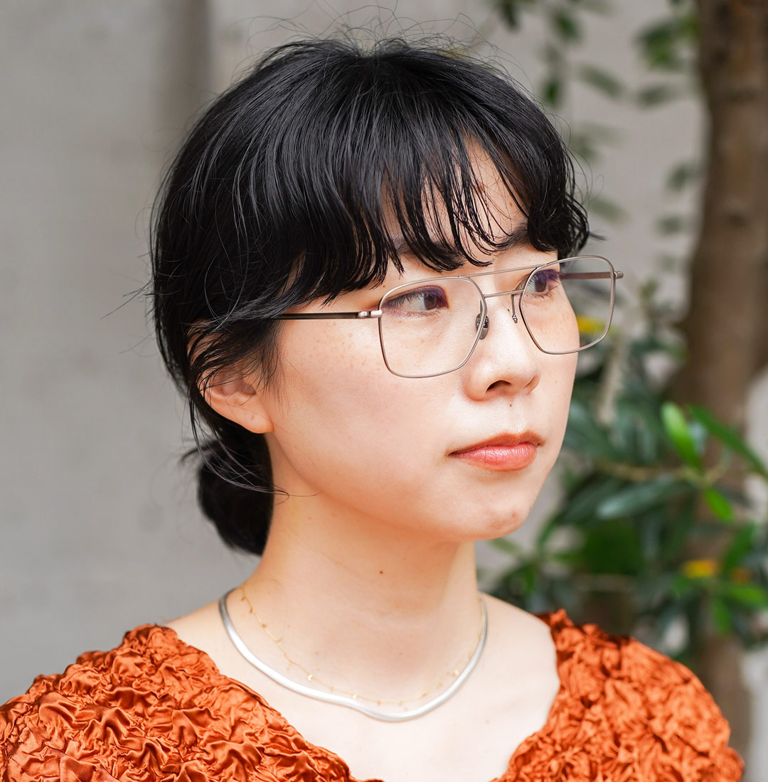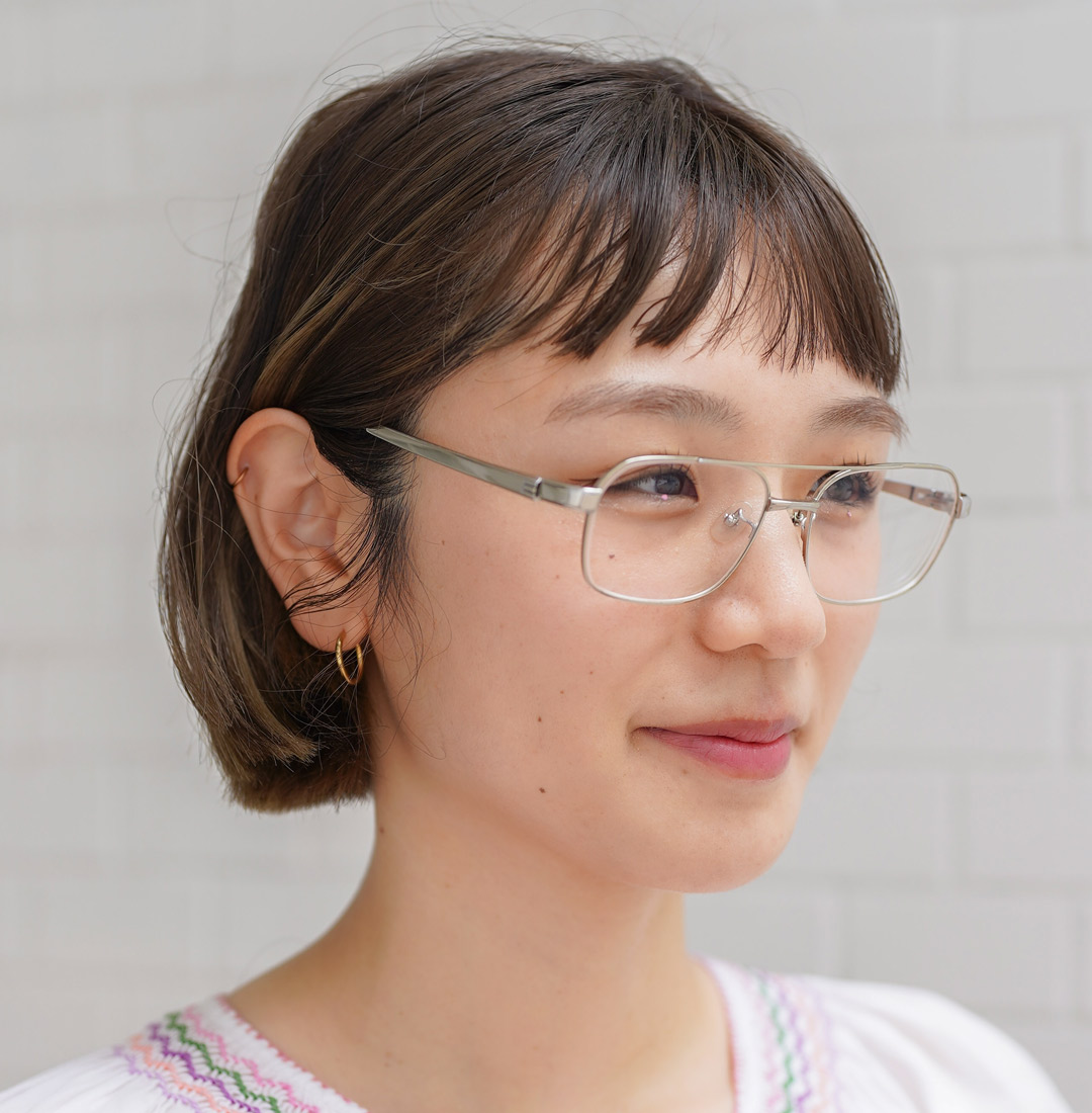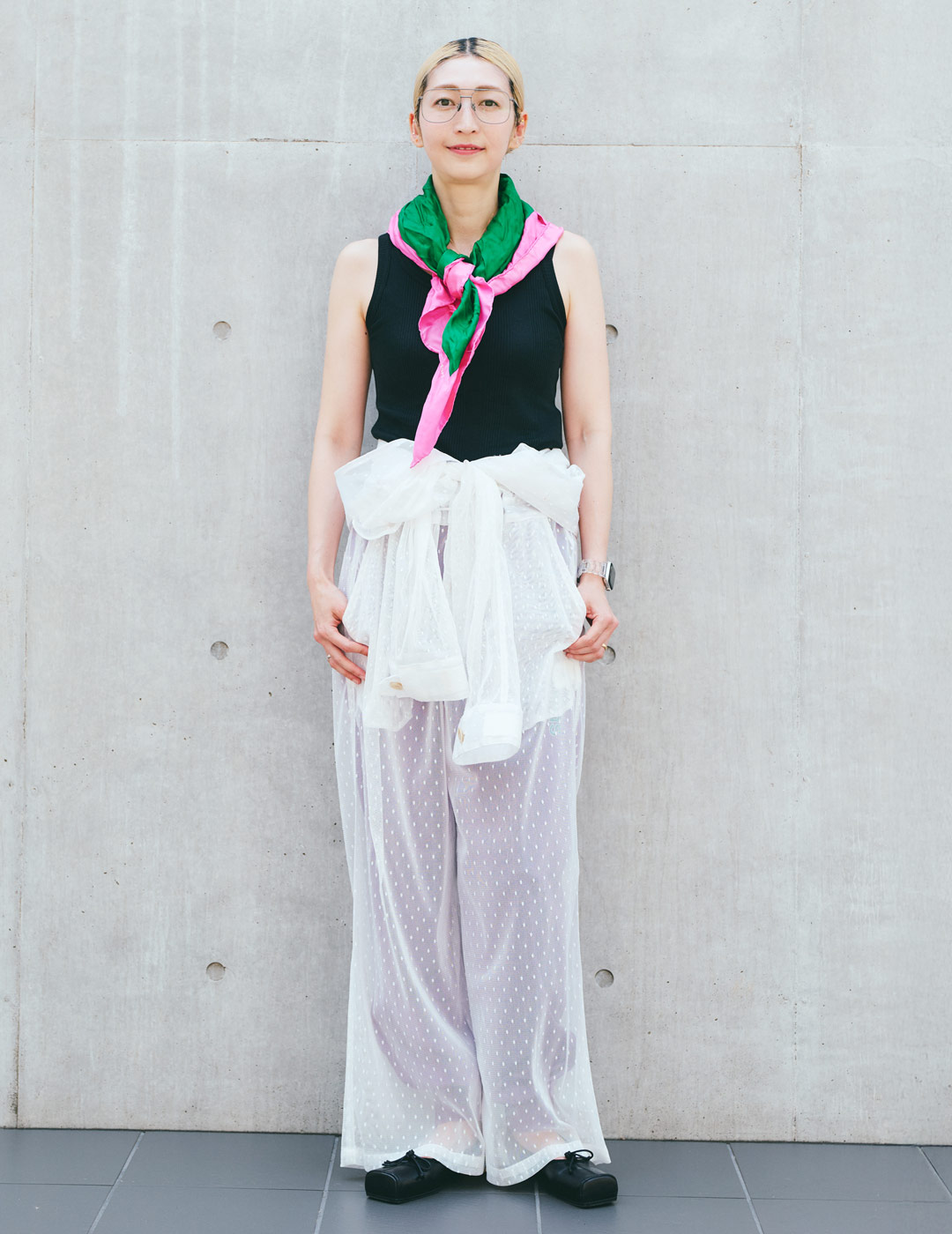 刺しゅうトップス、レースのラップスカート、パサールバッグで、クラフト感たっぷりのアイテムをバランスよく着こなしたsakuraさん。仕上げにシルバーフレームのダブルリッジメガネを添えて、全体をきゅっと引き締めれば、洗練された雰囲気が完成。