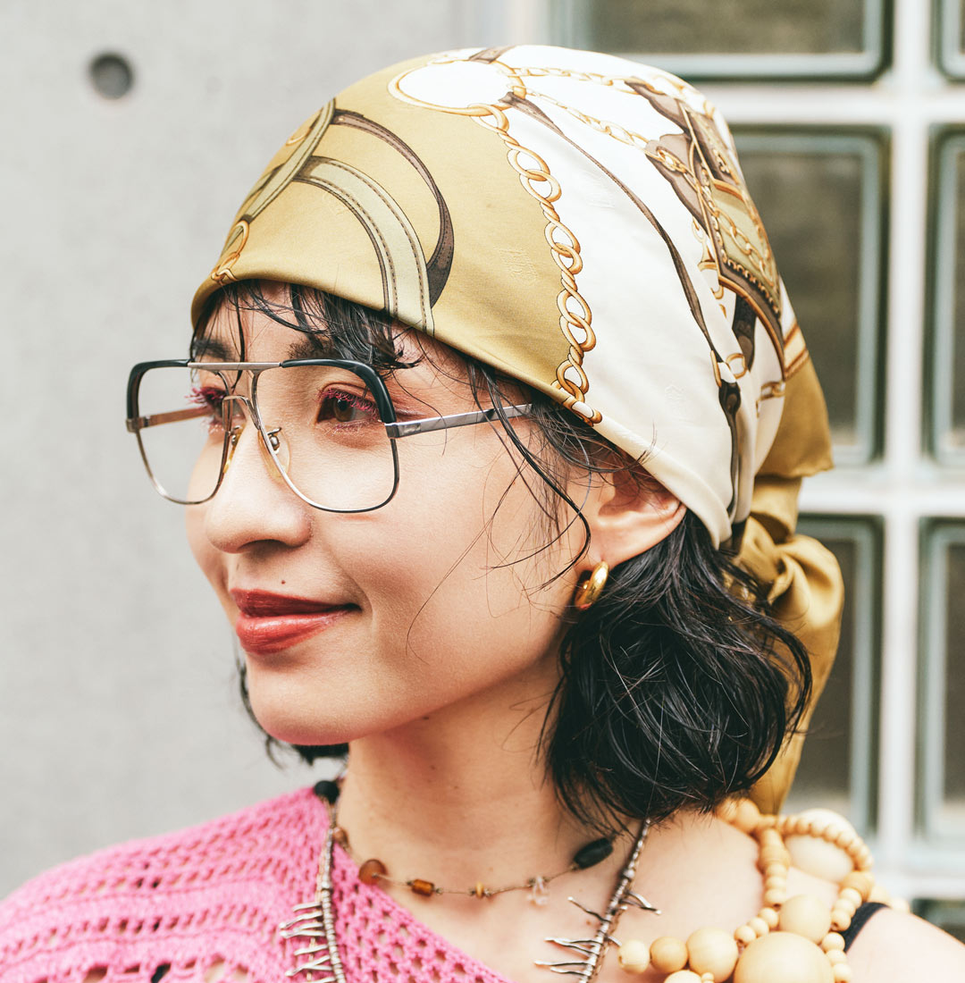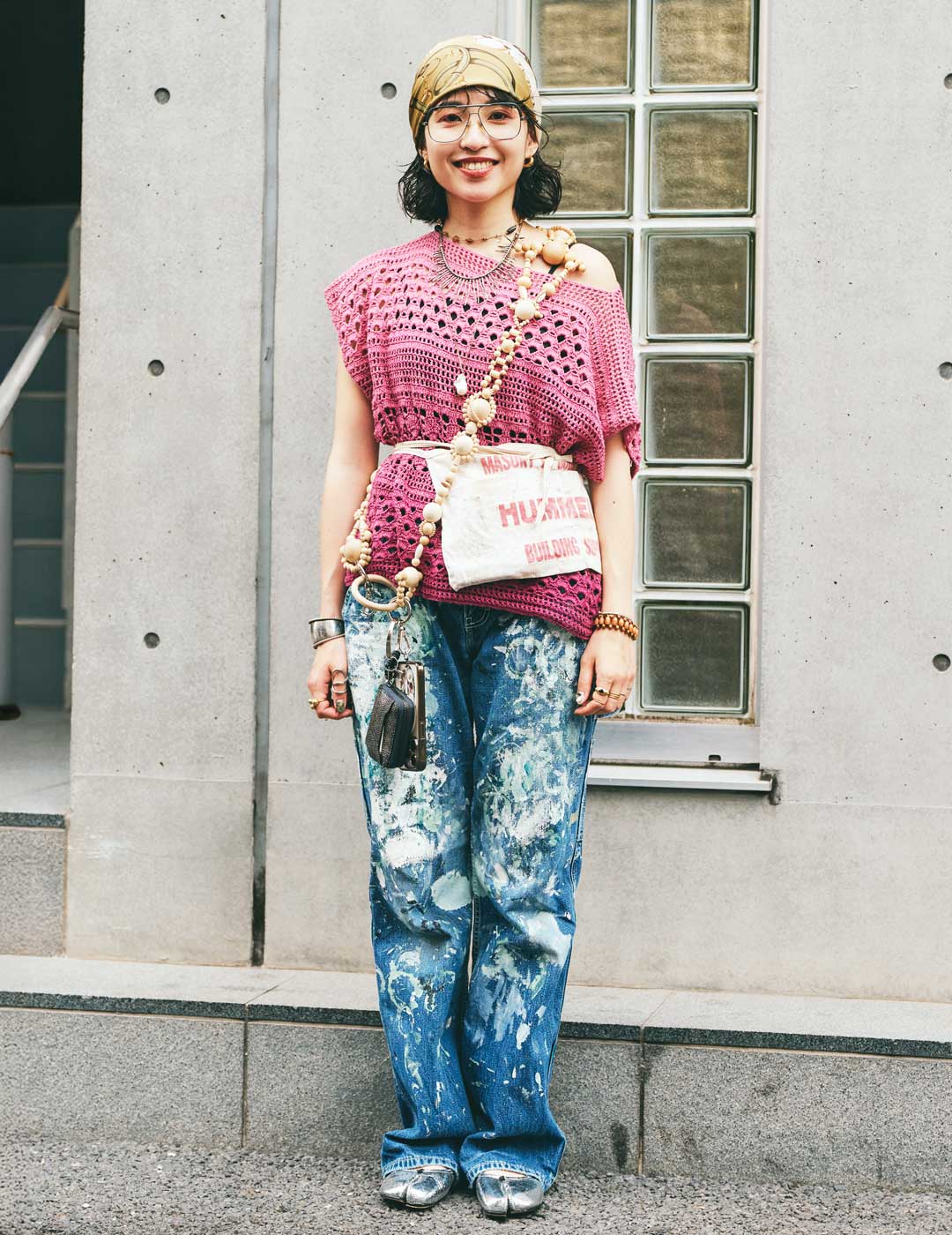 頭に巻いたスカーフとメンズライクなムードが漂うダブルリッジメガネで、旬なスタイルを満喫中のサトミさん。存在感たっぷりなダメージデニムに、ハンドメイドのカギ編みトップスを合わせたスタイルは、エッジィながらもどこかあたたかみを感じるバランスのよさ。小物やアクセサリー選びにもこだわった、センスのよさがキラリ!