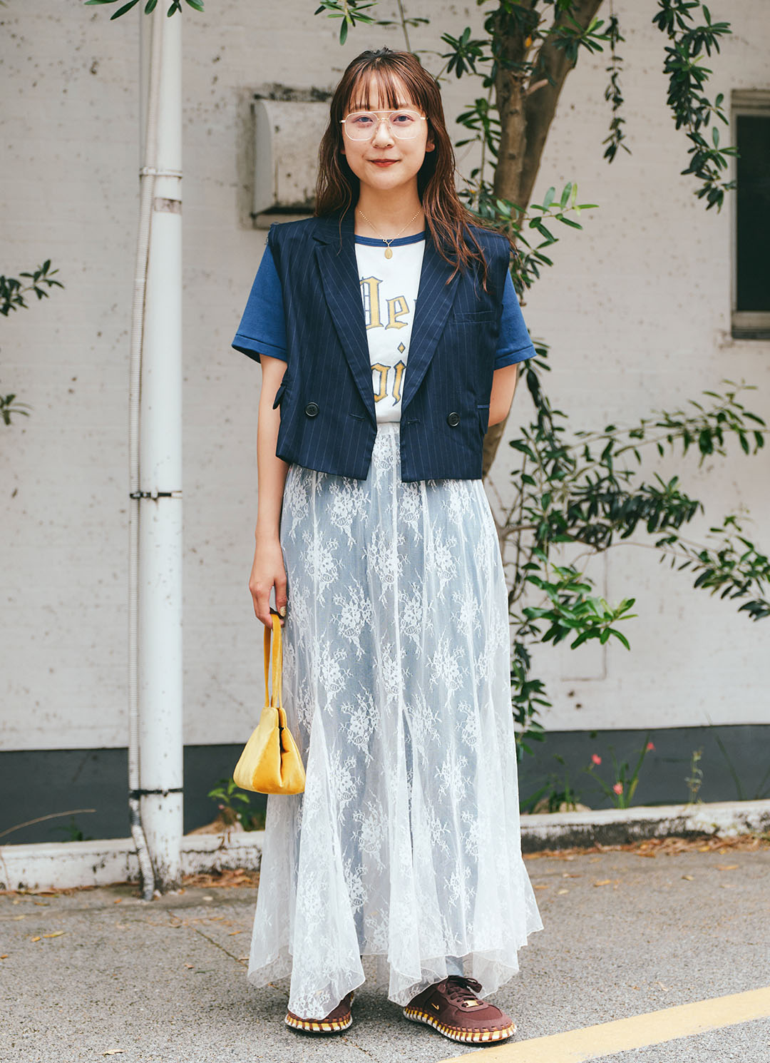 ほんのり透け感のあるシアーレースのスカートをパンツに、ストライプ柄のジレをプリントTにレイヤードした、かりんさん。バランスのよさが際立つレイヤードテクに脱帽♡ コーデに映えるフェルト素材のイエローバッグもアクセントになって大人可愛い雰囲気に。