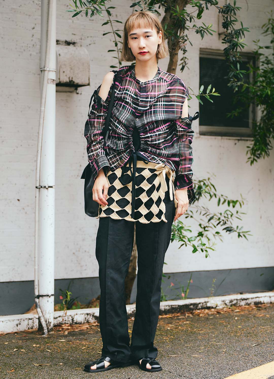 美シルエットが魅力の『メゾン マルジェラ』のボトムにレイヤードしたのは、『ロク』のニットスカート。かぎ編み風のデザインに、サイドをリボンで結ぶ遊び心たっぷりのディテールがアクセント。カットアウトが施されたブラウスを合わせて、全体をかっこよくまとめたハンサムウーマン。