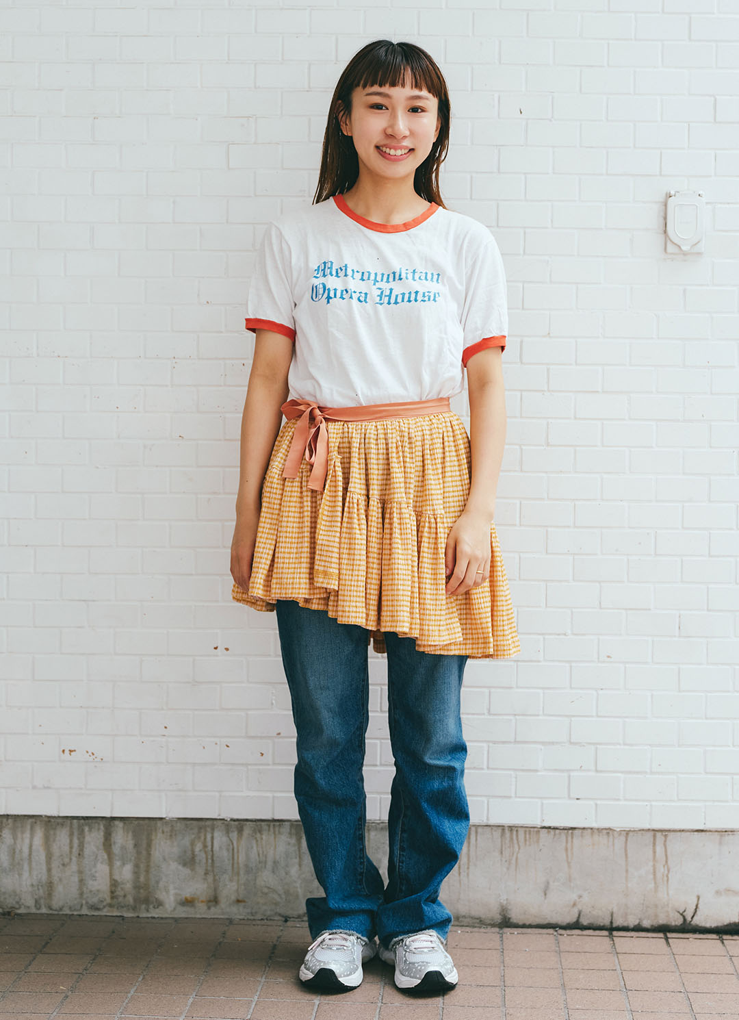 定番デニムにアシメになったプリーツスカートを合わせた、レトロキュートな装い。アイキャッチなプリントTで遊び心をプラスしつつ、足元は『アシックス』のスニーカーでほんのりスポーティに仕上げて。ウエストのリボンがさりげなく可憐なムードを添えてくれる。