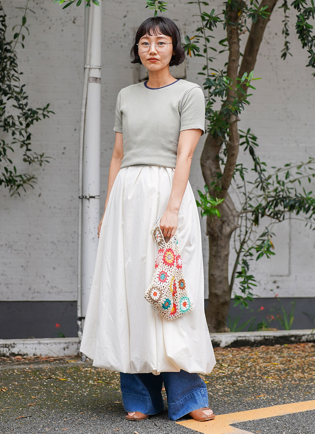 ふんわり感が可愛いバルーンシルエットは、1枚は持っておきたいトレンドアイテム。そこにデニムをレイヤードすれば、いつものコーデがぐっとこなれて見える! 全身をニュートラルなカラーでまとめることで、大人っぽさも演出。クラフト感が可愛いカラフルな手づくりバッグがアクセント。