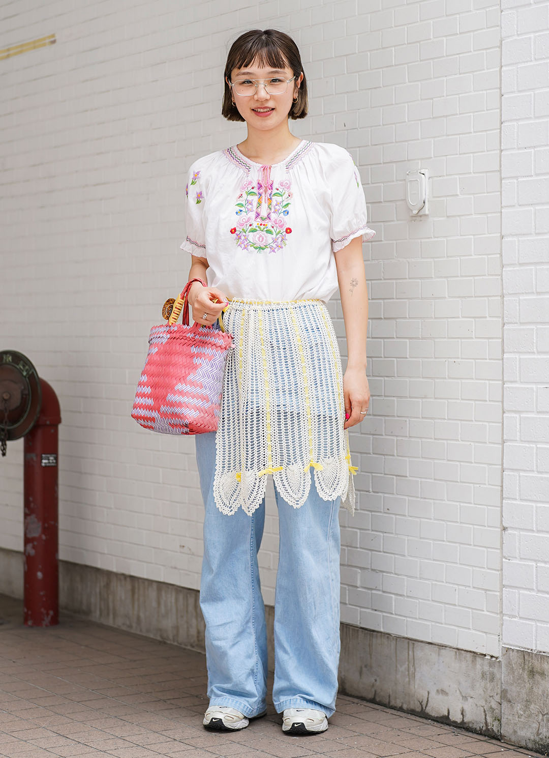 夏らしいライトブルーのデニムパンツに、『IAM』のレーススカートを重ねて、ナチュラルなこなれ感を演出したさくらさん。繊細な刺しゅうブラウスと、クラフト感あふれるメルカドバッグが温かみを添えて、コーデ全体をやさしいムードに♪