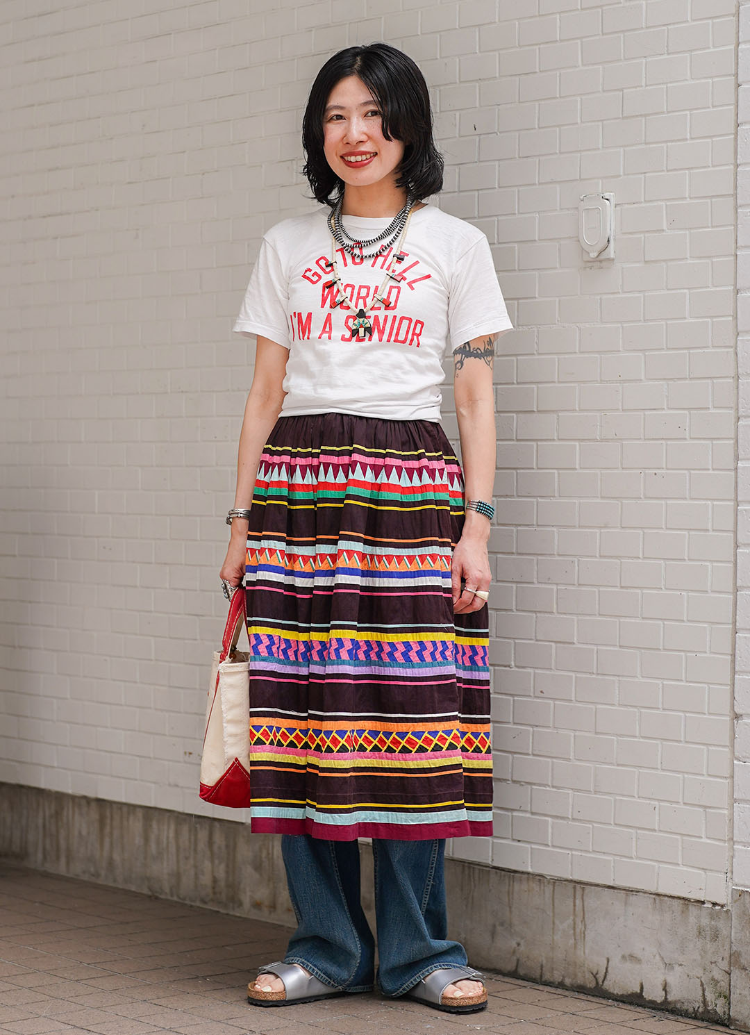 オリエンタルなムード漂うワンピースに、ヴィンテージのプリントTを重ねてこなれ感たっぷりなYUIさん。さらに、やわらか素材のデニムパンツをレイヤードして、抜け感もプラス。スカートが季節感をぐっと高めてくれるなか、足元は定番人気の『ビルケンシュトック』のアリゾナでラフに仕上げて。