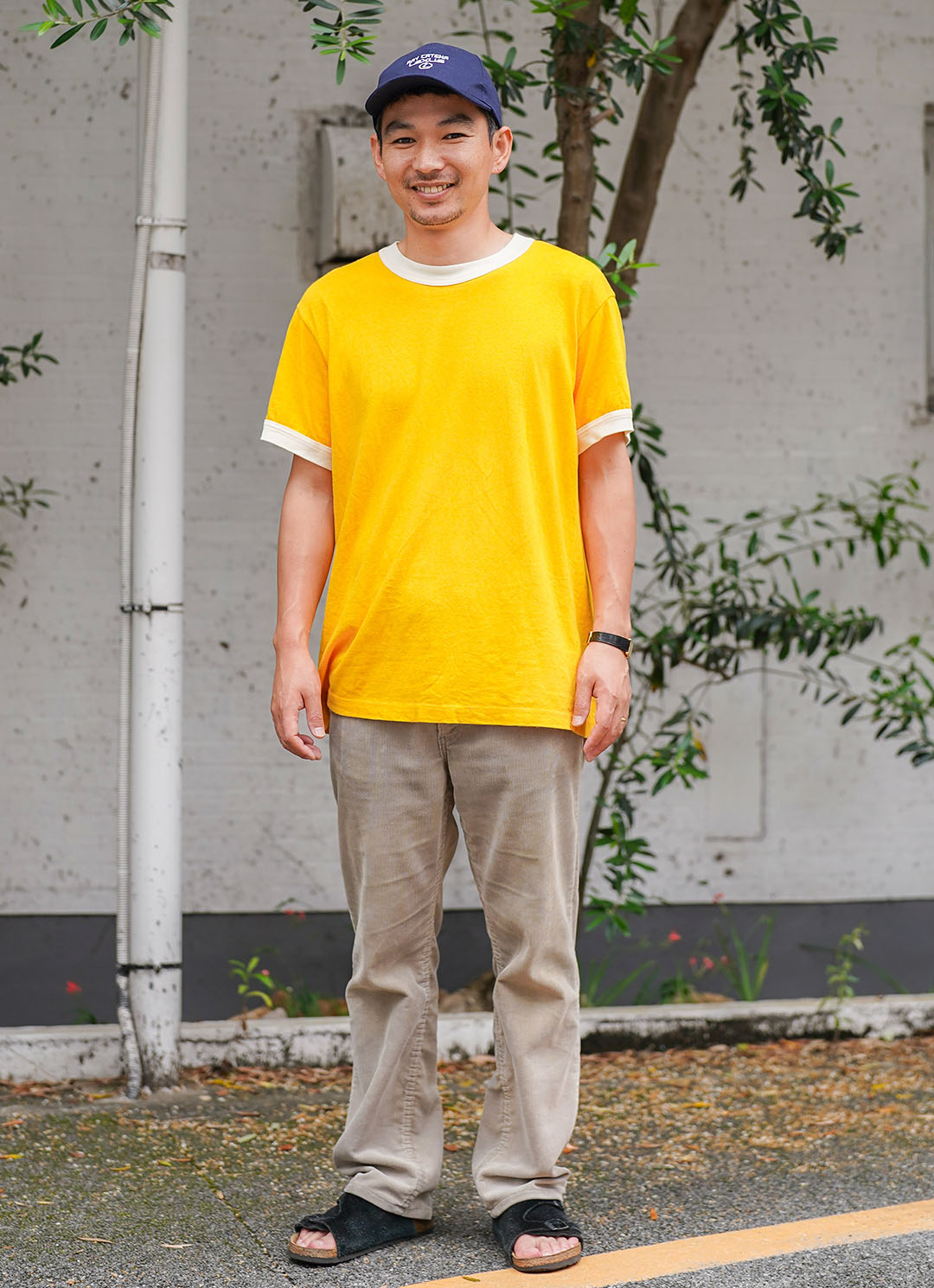 Tシャツに、ベージュのボトム、キャップ、そして足元は『ビルケンシュトック』の人気ライン、チューリッヒ。鮮やかなイエローTシャツを効かせた、サマーバイブス全開なパパスタイル。白のパイピングが施されたTシャツは、どこかレトロなムードも漂って、周りと差がつく1枚!