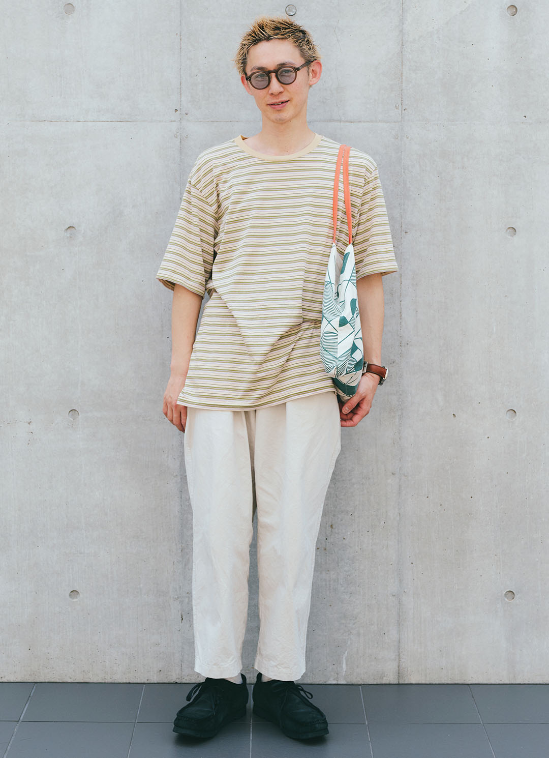 ペールイエローやモスグリーンなど、ニュアンスカラーのボーダーTシャツにリラックス感のあるボトムを合わせたナチュラル感が魅力のtakuroさん。肩の力を抜いた着こなしが今っぽくておしゃれ! 知的なラウンド型サングラスが、ナチュラルコーデをぐっと格上げ。