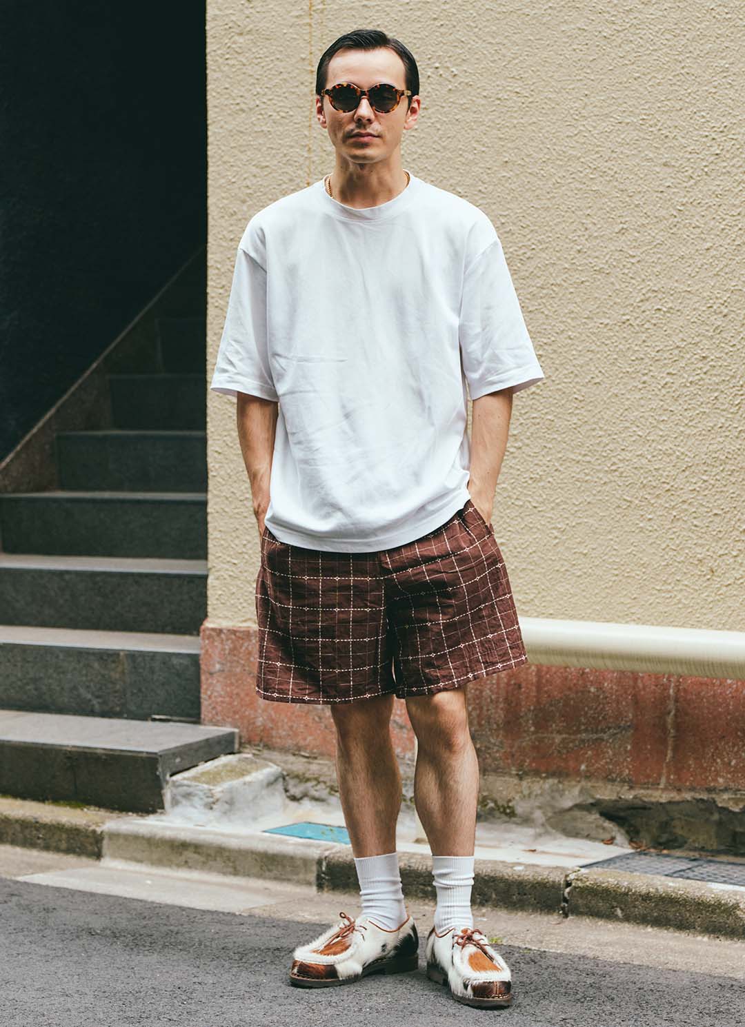 1枚は絶対に持っておきたい『ユニクロ』の名品Tに、チェック柄のショートパンツを合わせてシルエットの美しさを際立たせたアキラさん。シンプルながらも計算されたバランスで、Tシャツがしっかり主役に。足元は、ハラコのレザーシューズでエッジの効いたストリートムードをプラス。